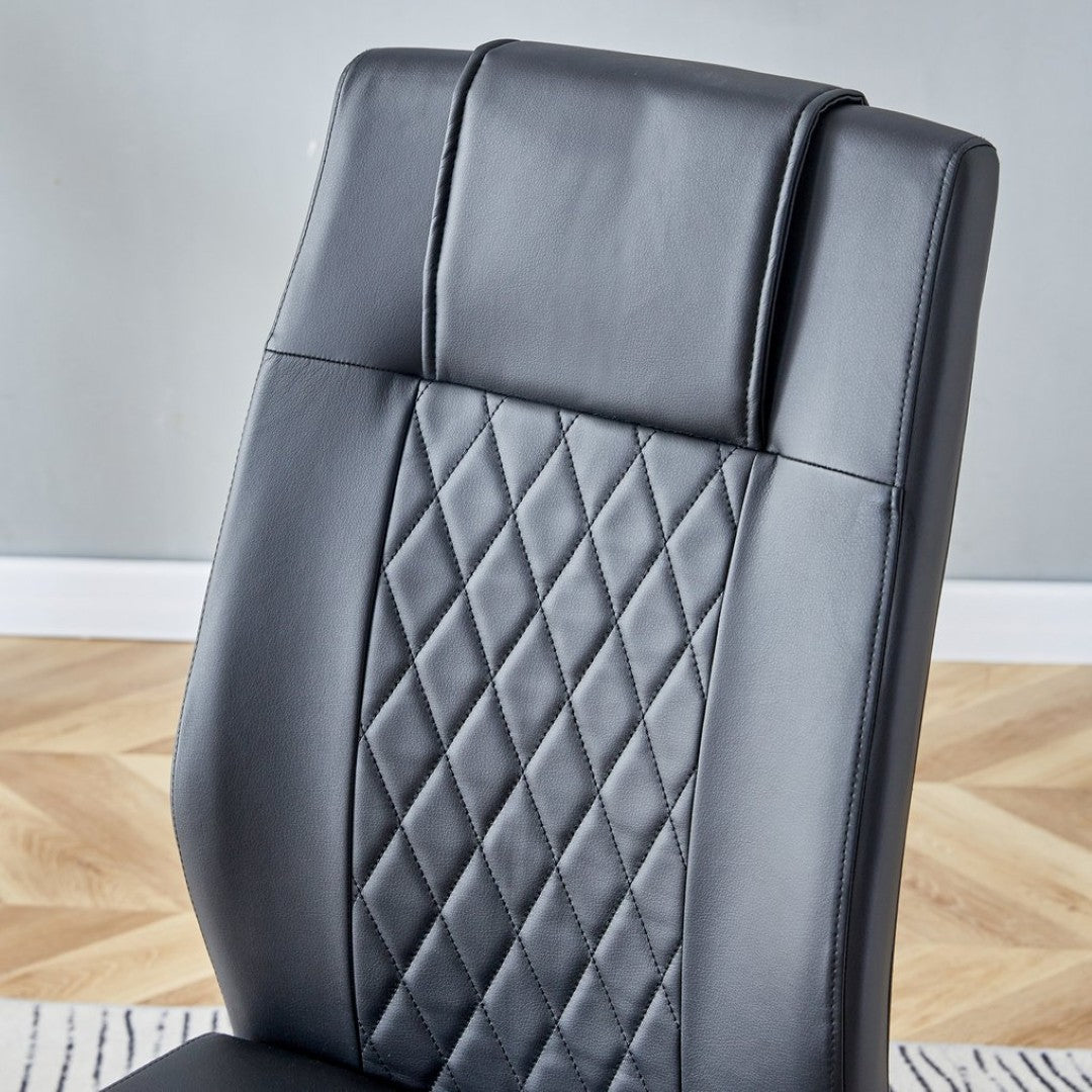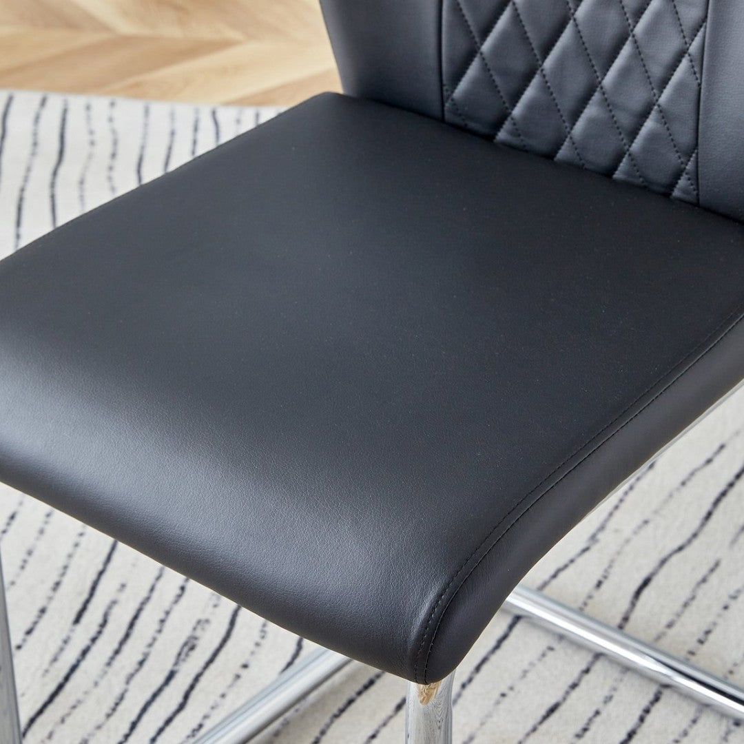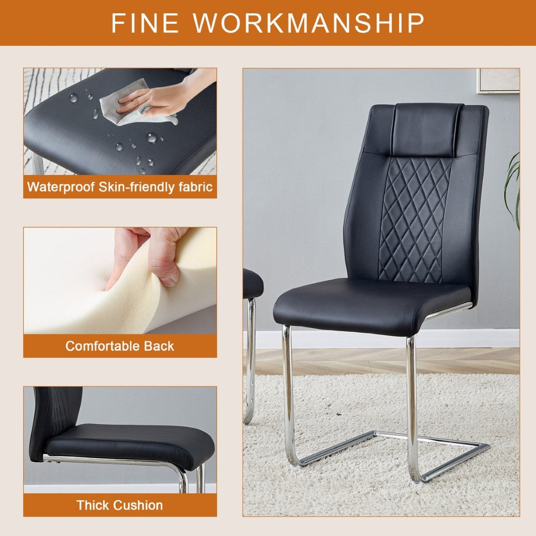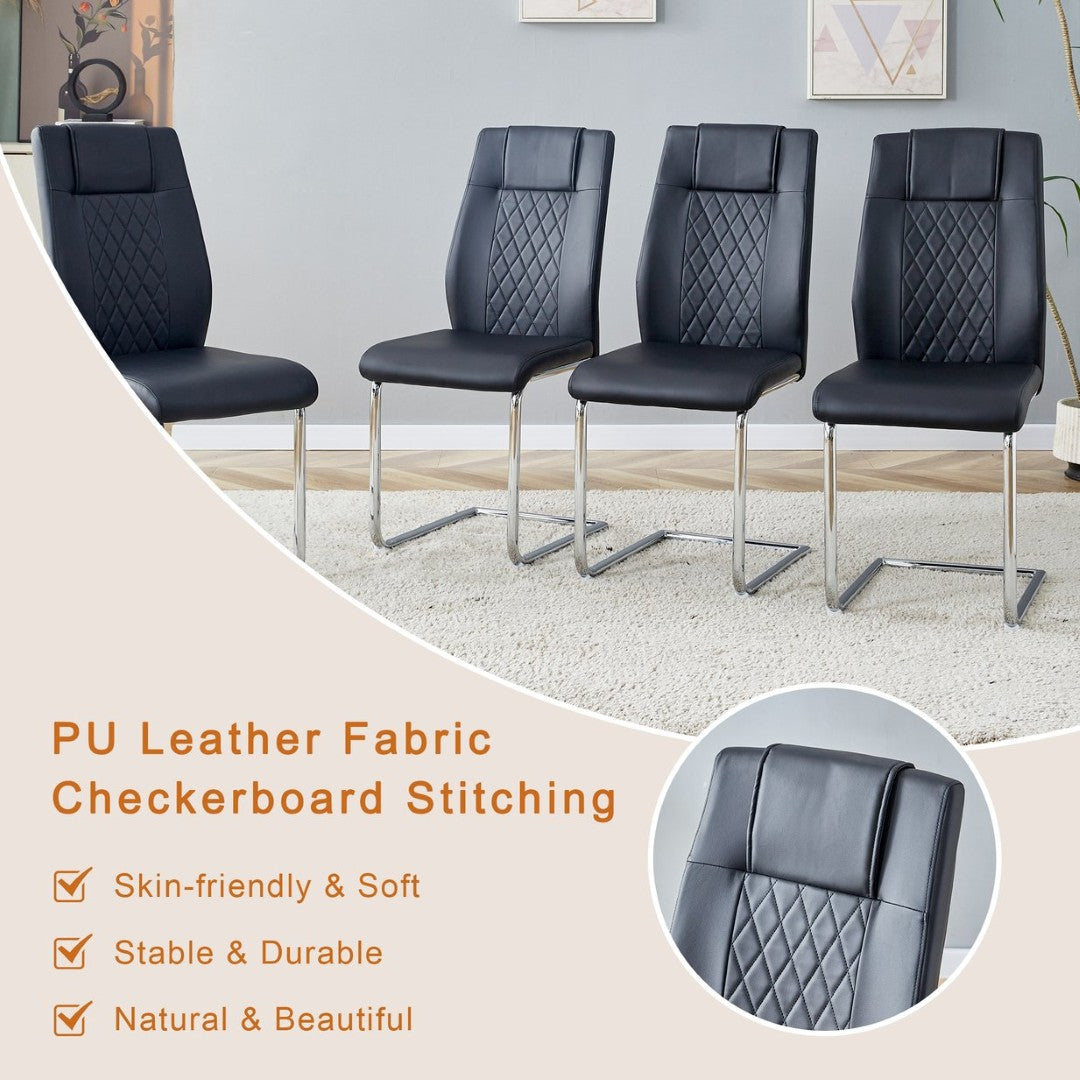 - Comfortable Black PU Chairs (x6): High-quality PU upholstery with grid-pattern backrests, sponge-filled cushions for soft support, and silver metal legs that visually coordinate with the table.