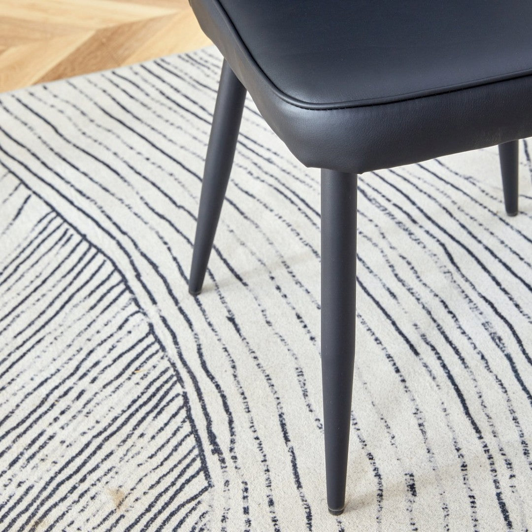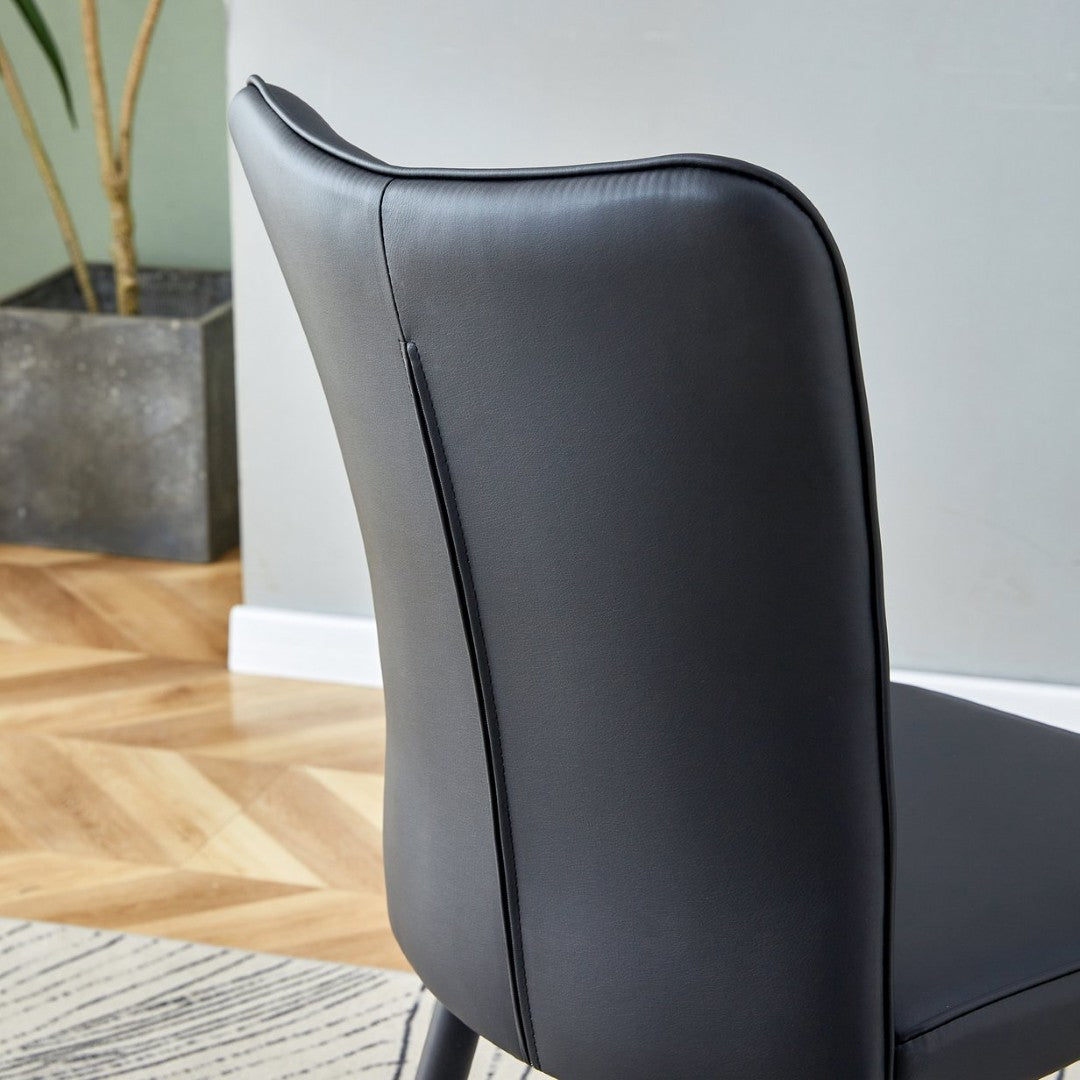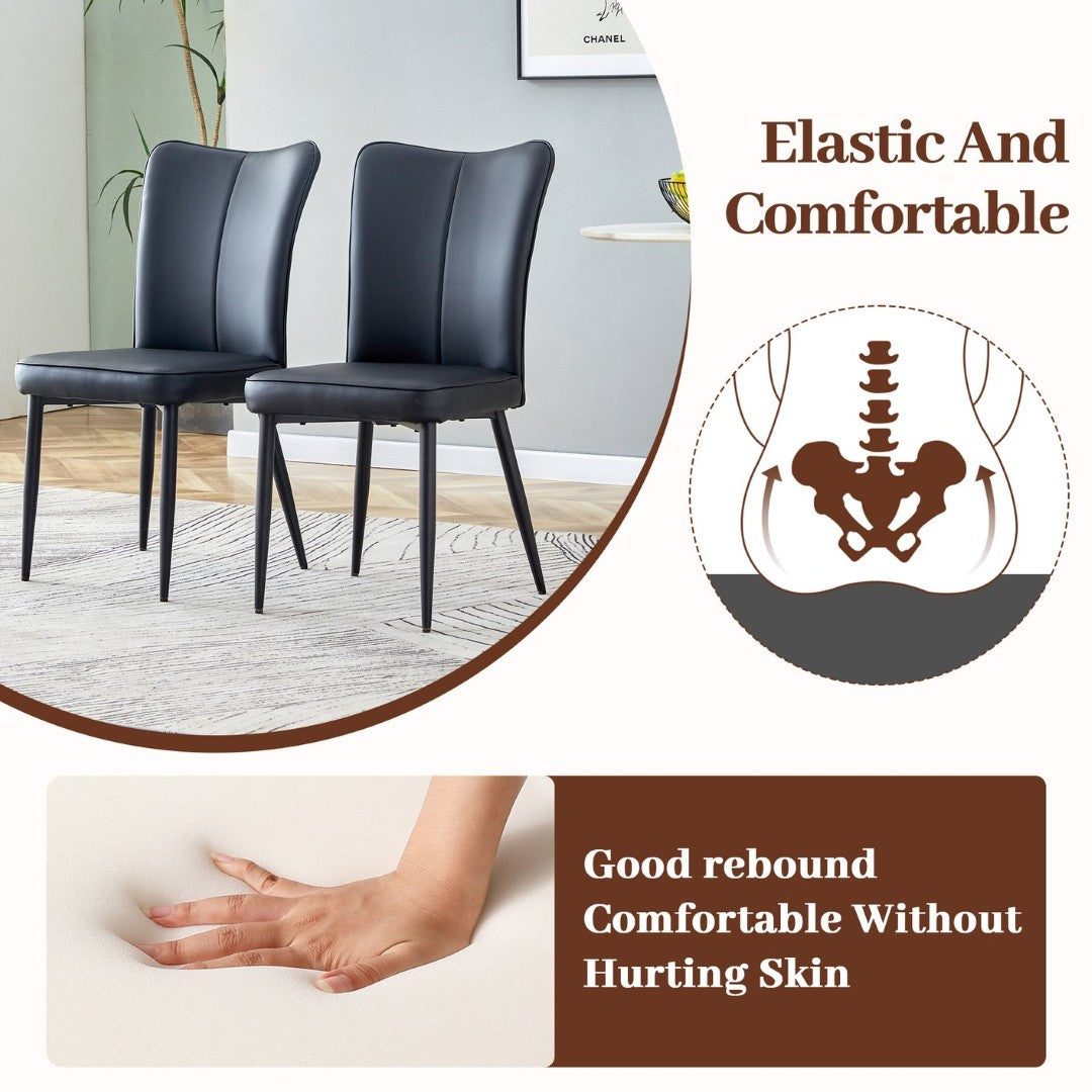 - PU Material for Comfort: The black chairs are made of PU material, with a vertical line design on the backrest that adds aesthetic detail while offering a soft and comfortable seating experience.Black Metal Chair Legs: The black metal legs of the chairs echo the table legs, creating a coordinated and unified look that showcases the refinement and fashion of modern home furnishings.