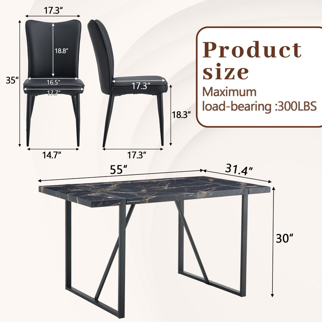 Bring modern elegance to your dining space with this coordinated 5-piece set featuring a sleek black marble-pattern MDF table and four comfortable black PU chairs. Designed for everyday use and small gatherings, the set pairs contemporary aesthetics with practical construction for lasting style and comfort.