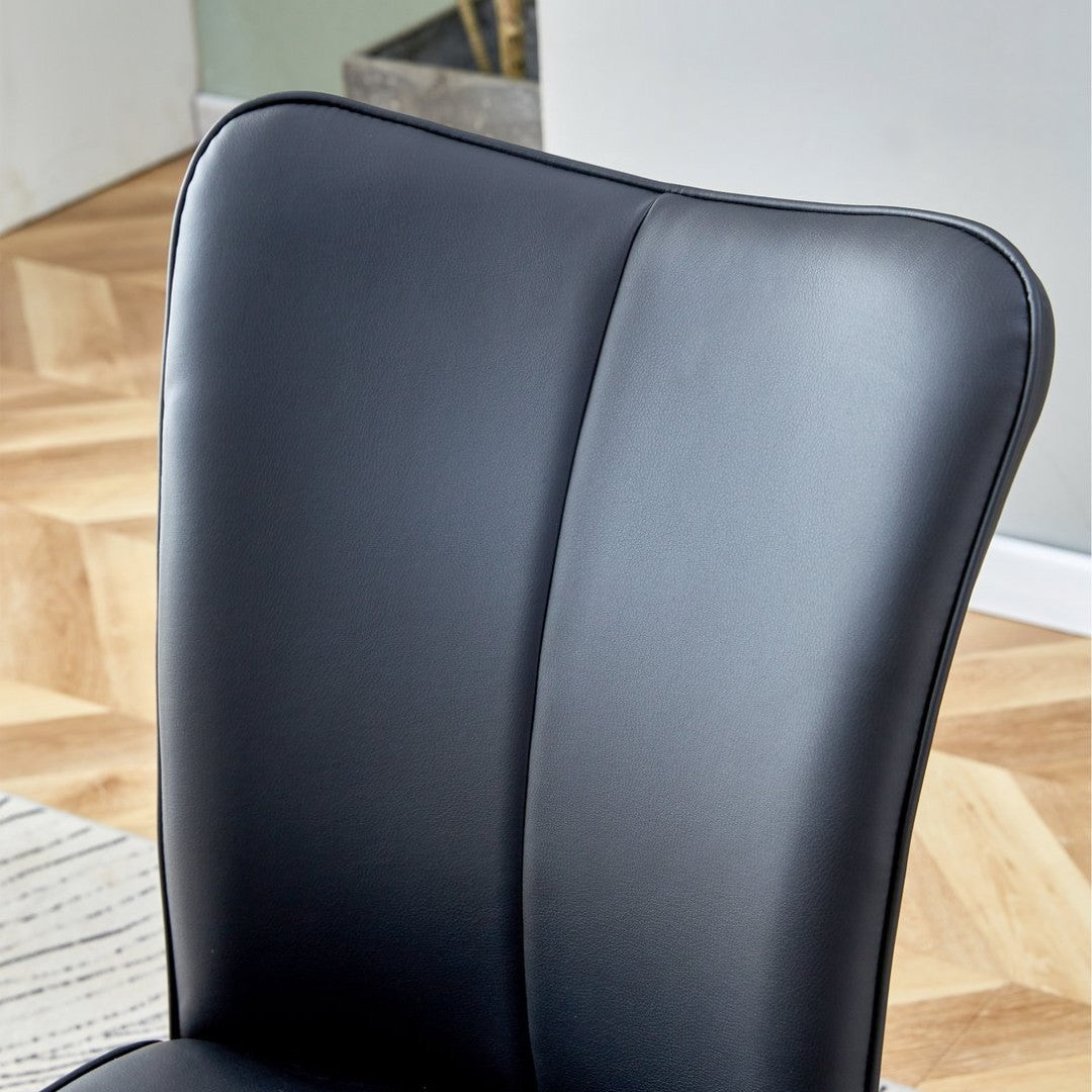- Comfortable seating: Four ergonomically contoured chairs upholstered in black PU with vertical stripe detailing on the backrests; high-density sponge padding provides soft, supportive seating.