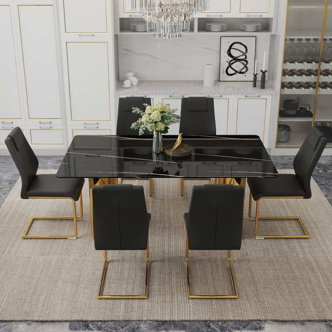 Elevate your dining space with this modern table and chair set, combining luxe finishes with practical comfort. The glass tabletop features a refined imitation marble pattern and is supported by golden stainless steel legs, while six black PU-upholstered chairs deliver cushioned seating and sturdy metal support—ideal for family meals or entertaining guests.