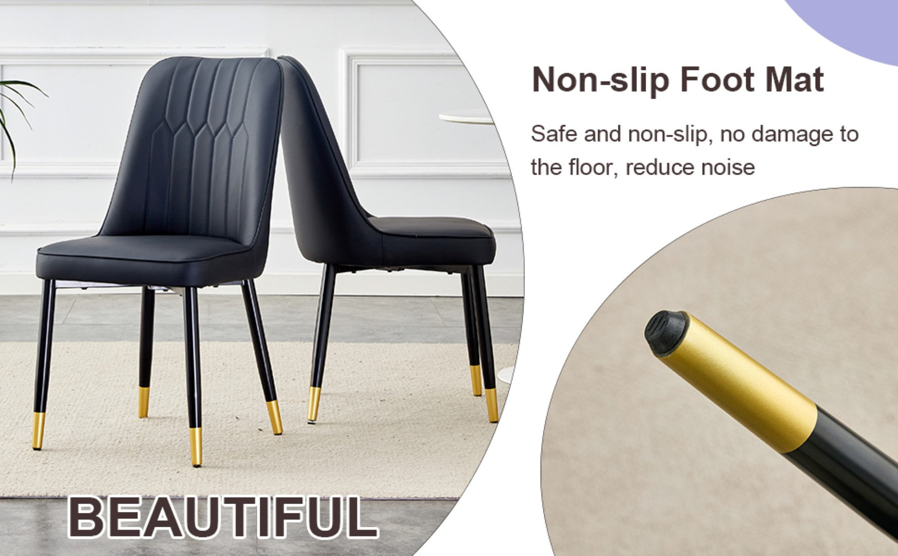 - Gold Spray Decoration: The lower part of the chair legs near the ground is decorated with gold spray, adding a touch of luxury to the design.Anti-slip Floor Feet: Considering the safety and stability of use, the bottom of the chair legs is specially equipped with anti-slip floor feet, protecting the floor and ensuring the stability of the dining chairs during use.