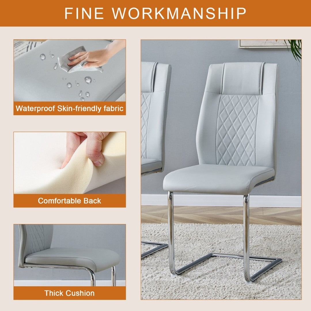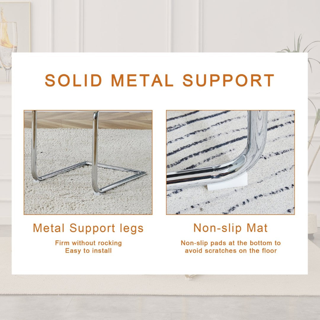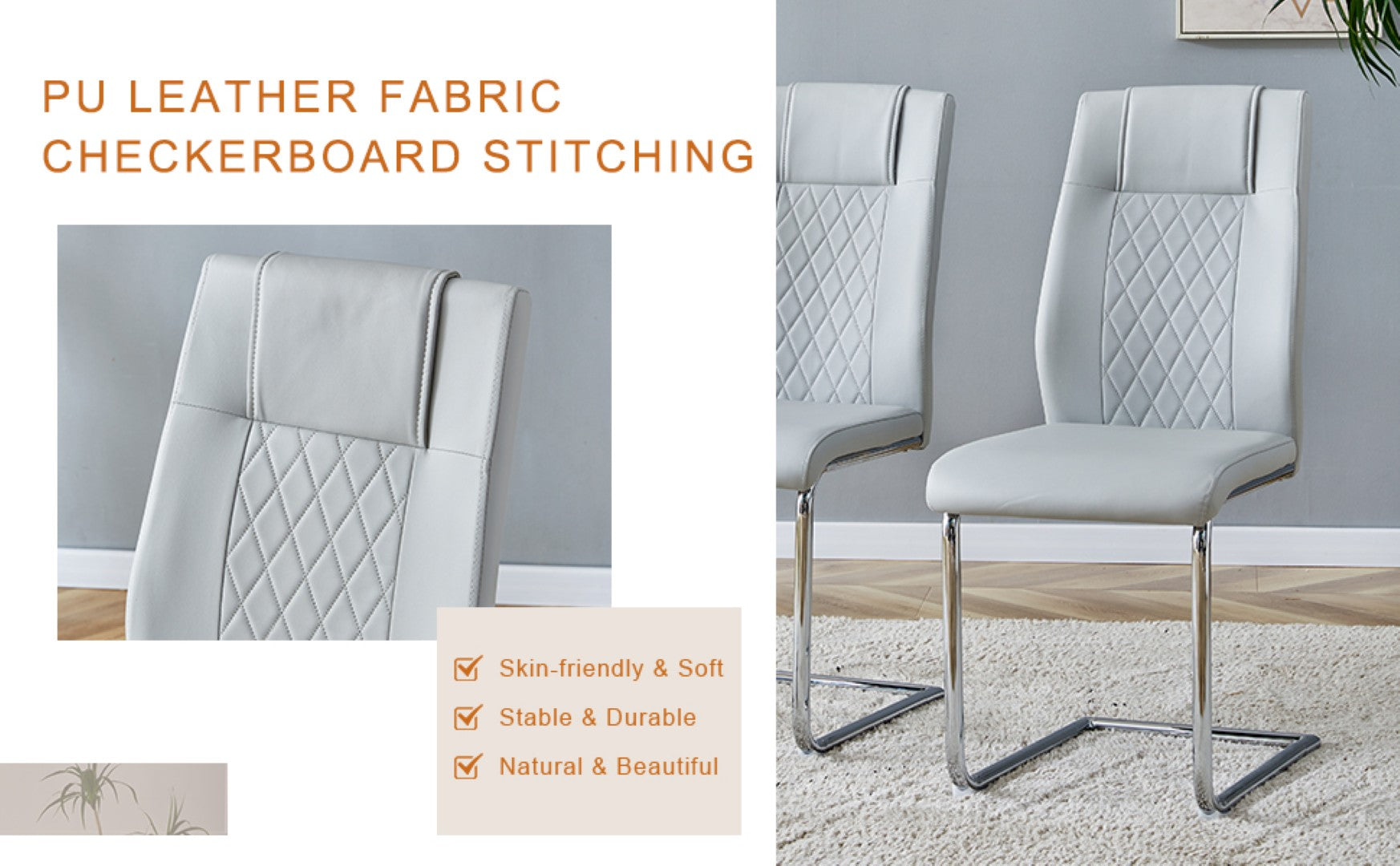 - Silver Metal Table Legs: The silver metal legs are designed in a unique fork shape, providing not only stability but also a modern and stylish look to the dining table.Silver Metal Chair Legs: The silver metal legs of the dining chairs contrast beautifully with the light gray PU chairs, adding a bright touch and reflecting the refinement and luxury of modern home furnishings.The silver metal legs of the chairs echo the table legs, creating a coordinated and unified look.