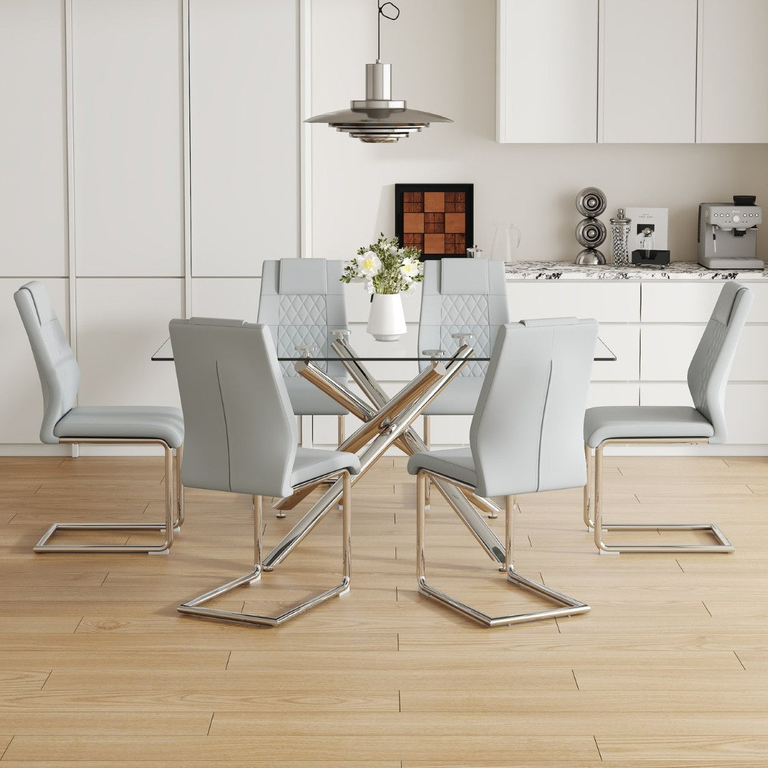 Elevate your dining space with this modern, luxurious 7-piece dining set that blends high-clarity tempered glass with sleek silver metal accents and comfortable light-gray PU upholstery. Designed for contemporary homes, the set combines durable materials, thoughtful ergonomics, and a coordinated aesthetic to deliver both visual appeal and everyday practicality—ideal for family meals, entertaining, or stylish office dining.