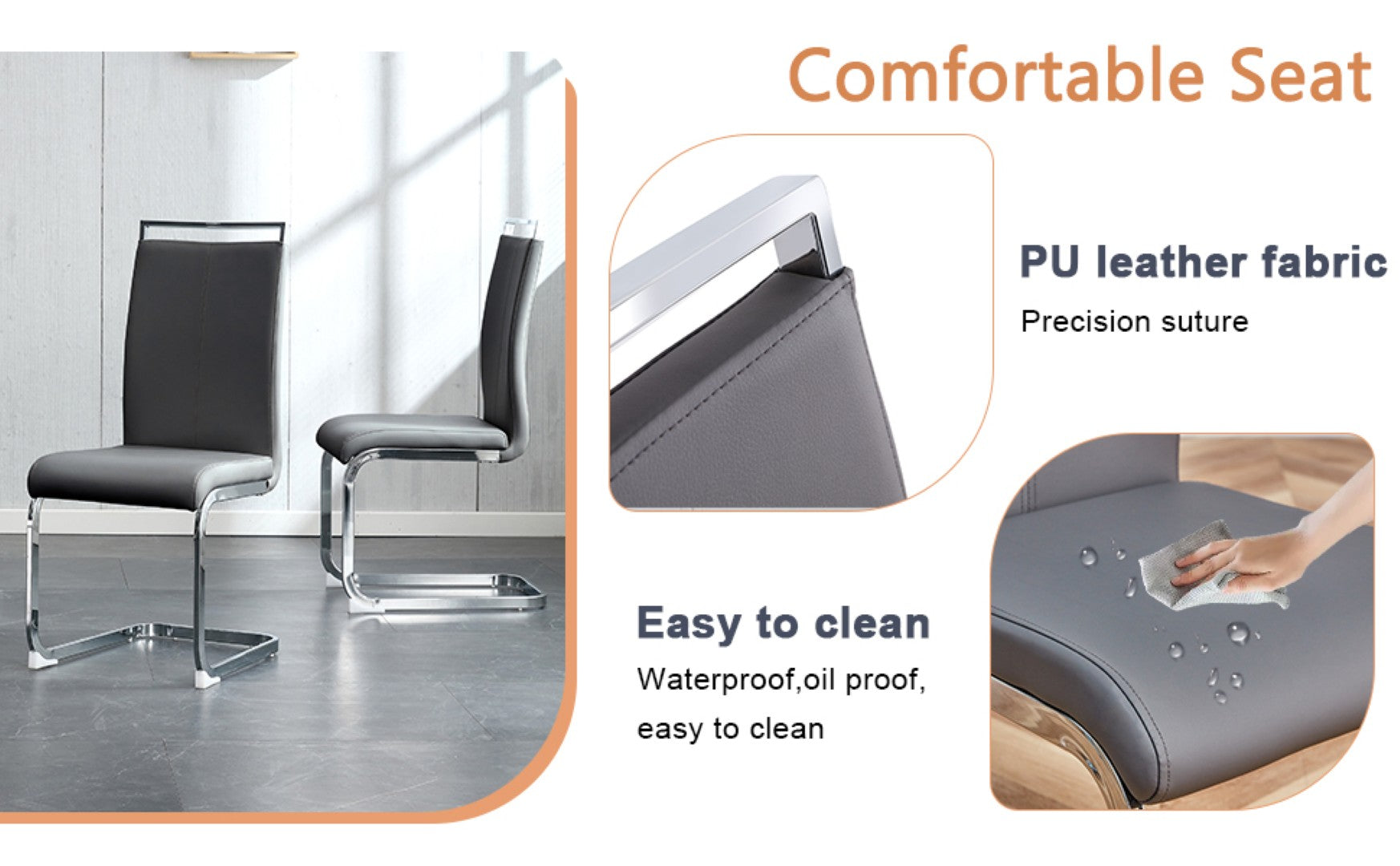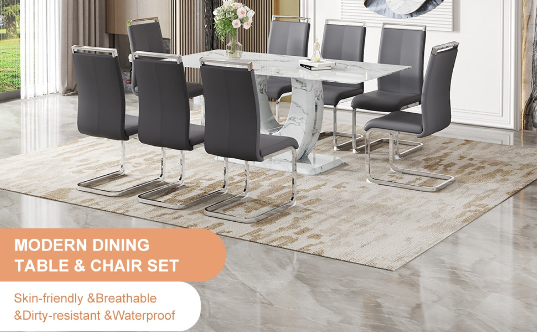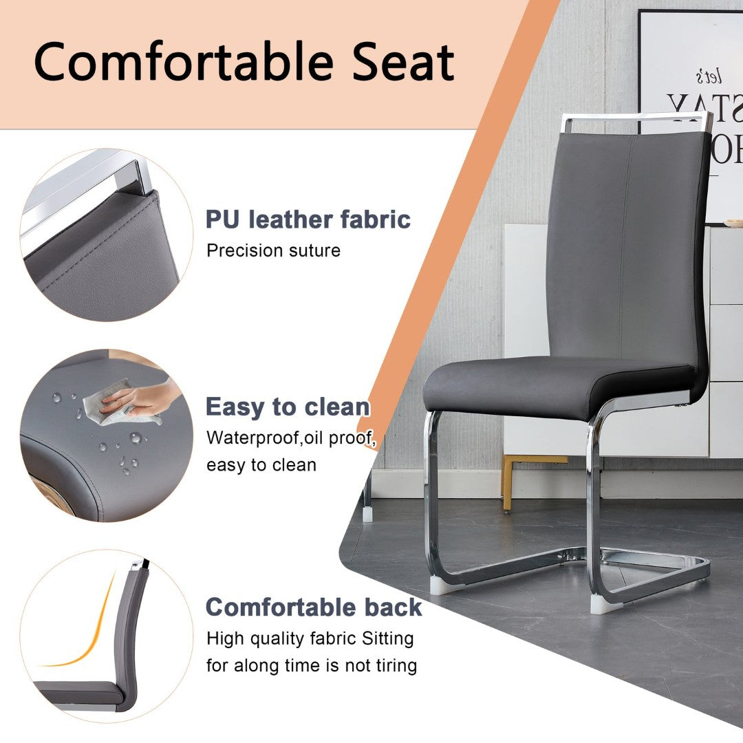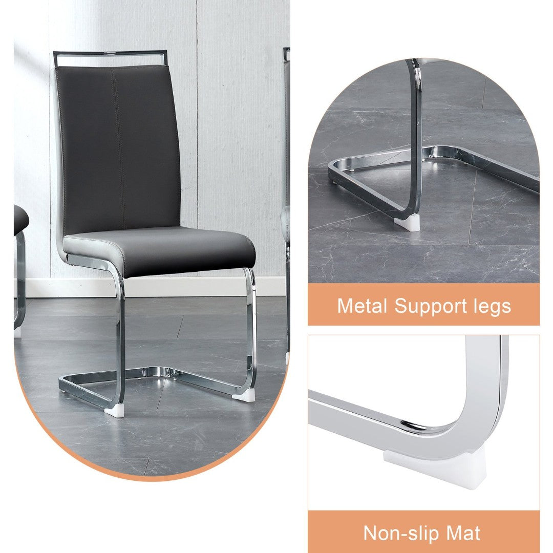 - Simple Dark Gray PU Chairs: The chairs feature a simple dark gray PU material, harmonizing with the tabletop's marble pattern for a cohesive style.Comfortable Sponge Padding: The chairs are filled with sponge for a soft and comfortable sitting experience, with silver bow-shaped metal legs echoing the table leg design.