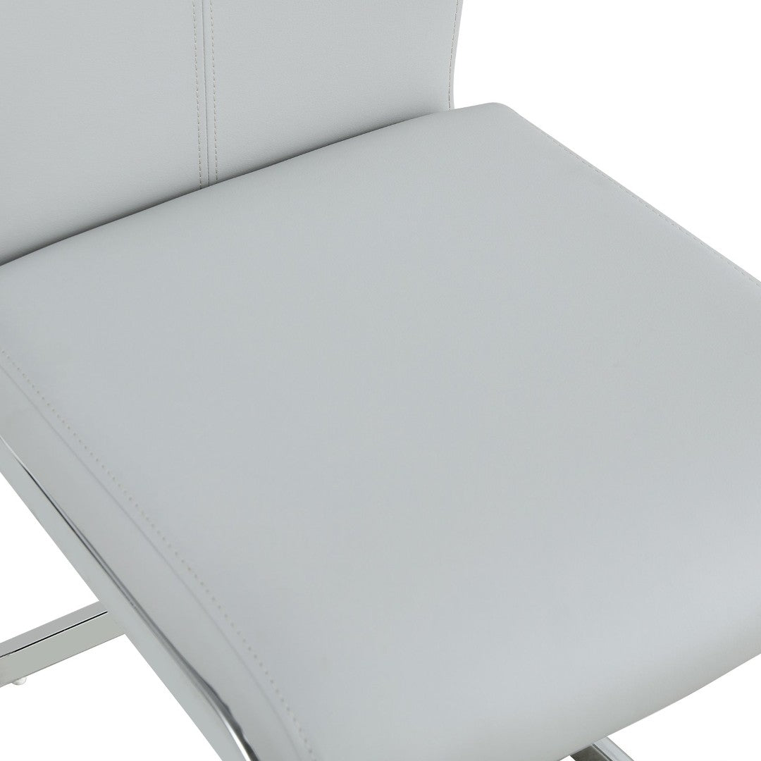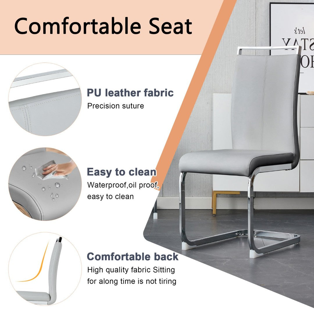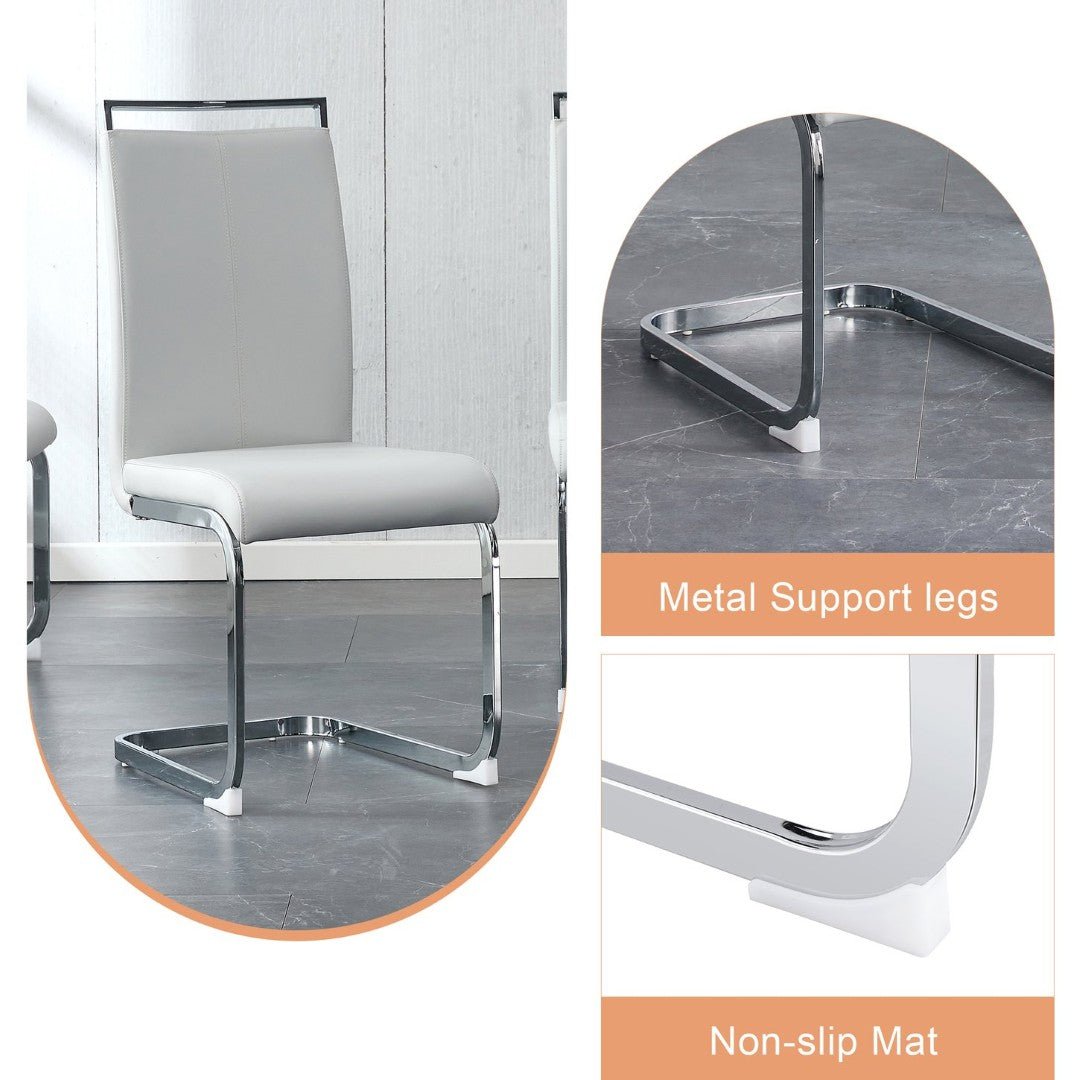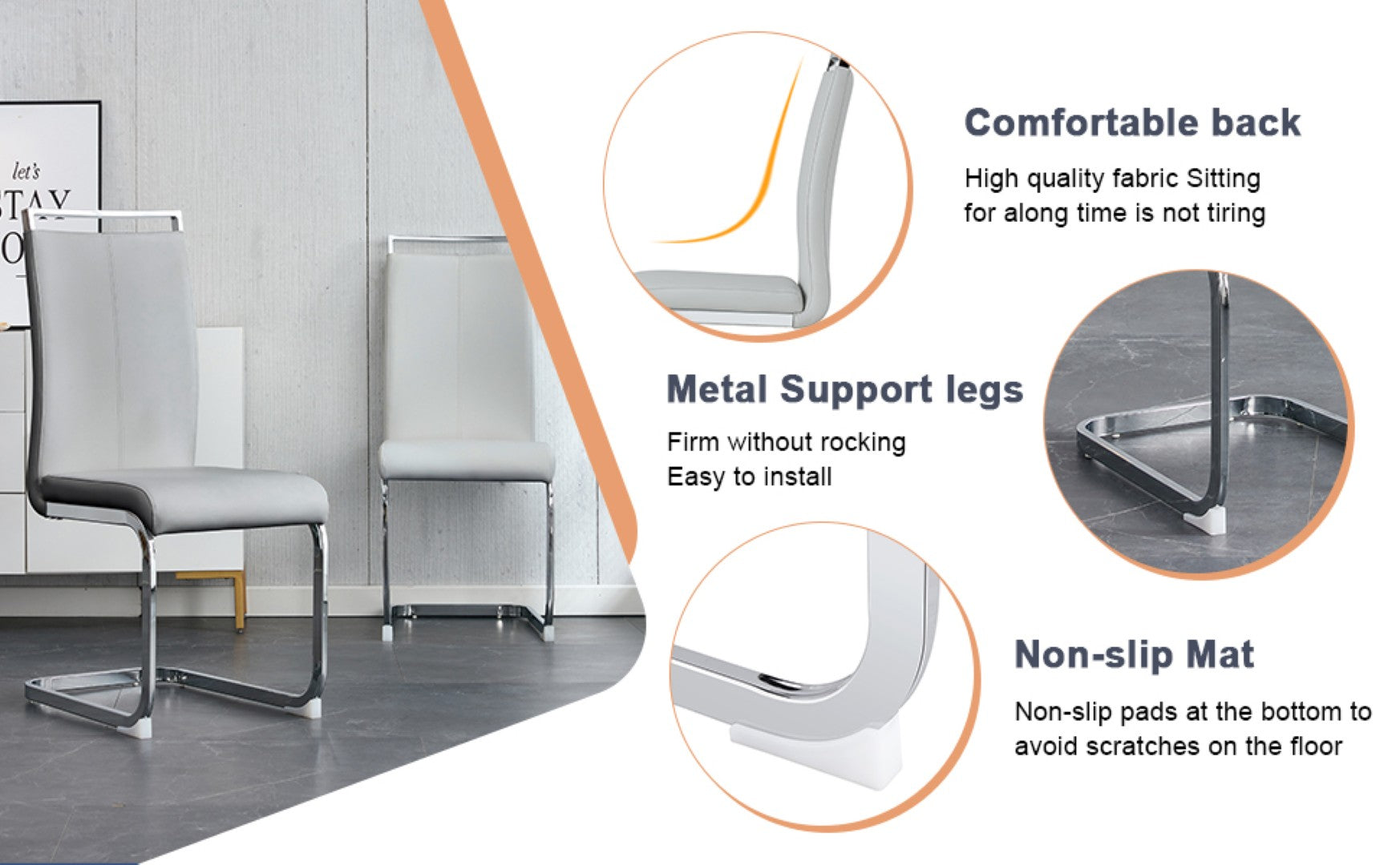 - Simple Light Gray PU Chairs: The chairs feature a simple light gray PU material, harmonizing with the tabletop's marble pattern for a cohesive style.Comfortable Sponge Padding: The chairs are filled with sponge for a soft and comfortable sitting experience, with silver bow-shaped metal legs echoing the table leg design.