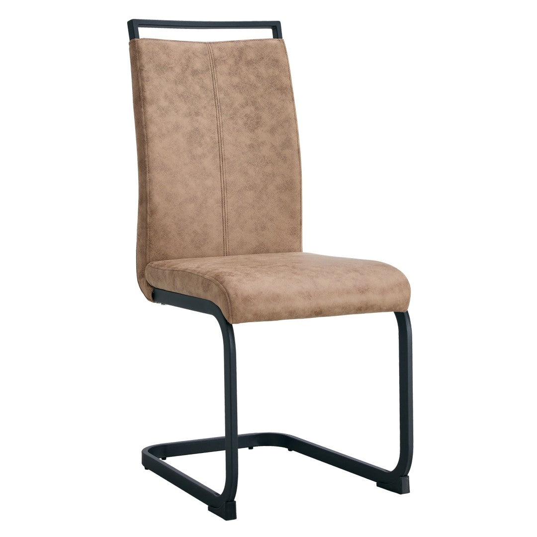 - Materials: Gray wood-grain MDF tabletop with a protective texture film; black powder-coated metal legs for both table and chairs; brown technology fabric upholstery on chairs.
