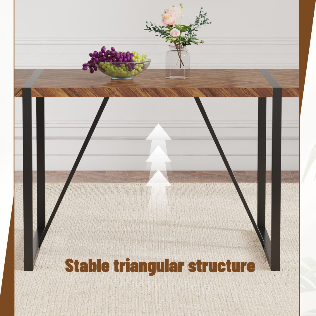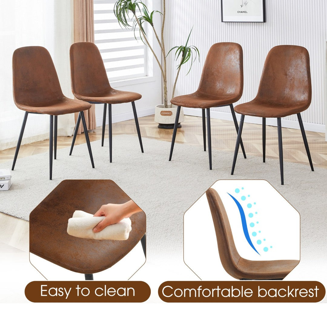 Bring retro charm and modern functionality to your dining area with this compact table and 4‑chair set. A fishbone‑patterned MDF tabletop adds visual interest and texture while black metal frames provide a sturdy, minimalist base. The four brown techno‑fabric chairs combine breathable comfort with ergonomic shaping for everyday meals, work-from-home tasks, and casual gatherings.