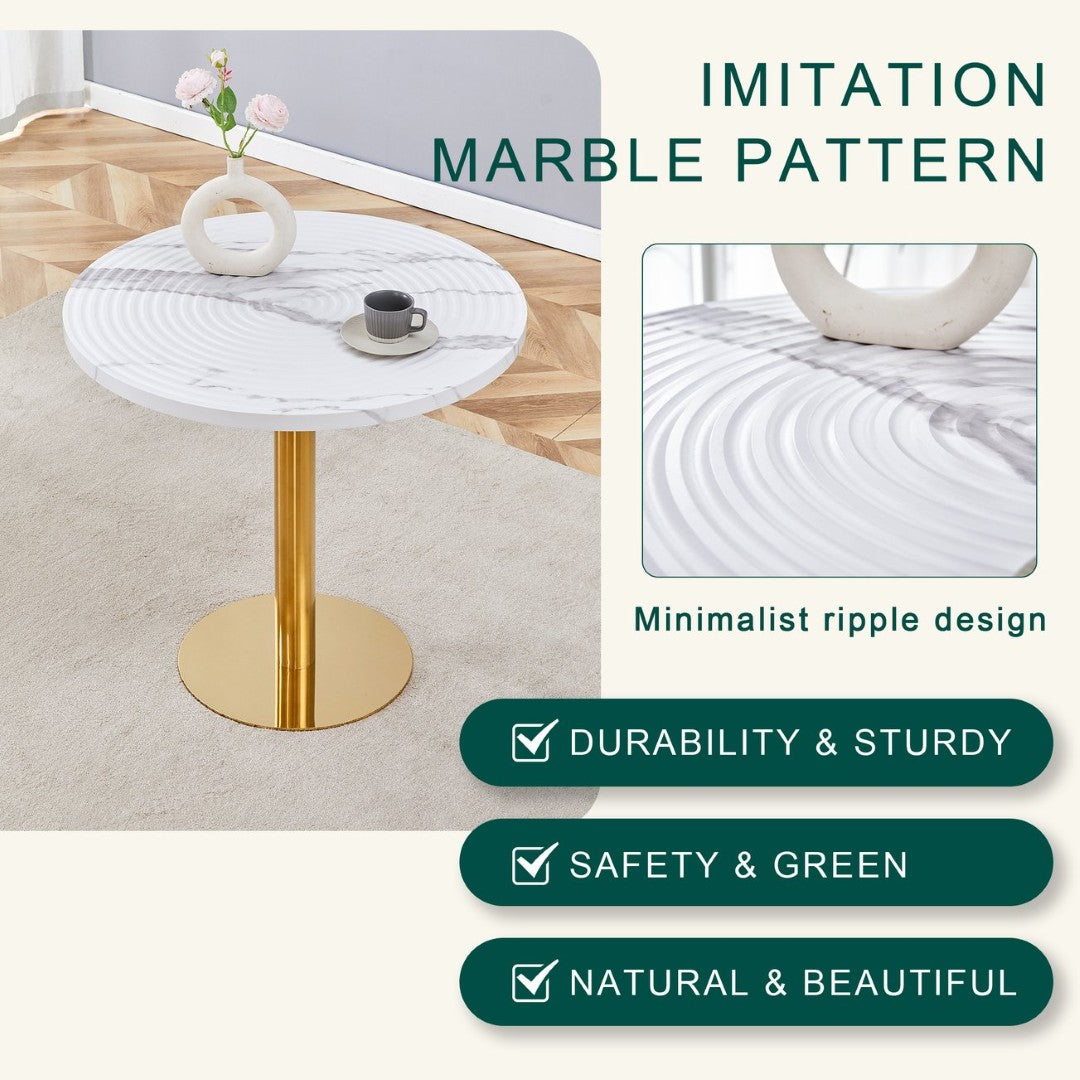 - Metal Stand: The table stand is made of sturdy metal with a gold spray finish, contrasting beautifully with the white marble pattern tabletop.Modern Design: The gold metal cylindrical straight legs and circular base provide stable support for the table while adding a modern and minimalist design style.