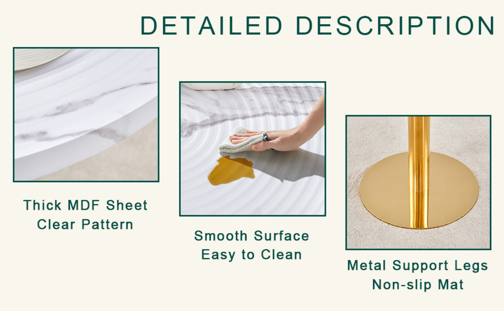 - Tabletop: Premium MDF construction with a 1.2-inch thickness and an exquisite white marble pattern achieved via suction molding and annular texture for durable, wear-resistant finish.