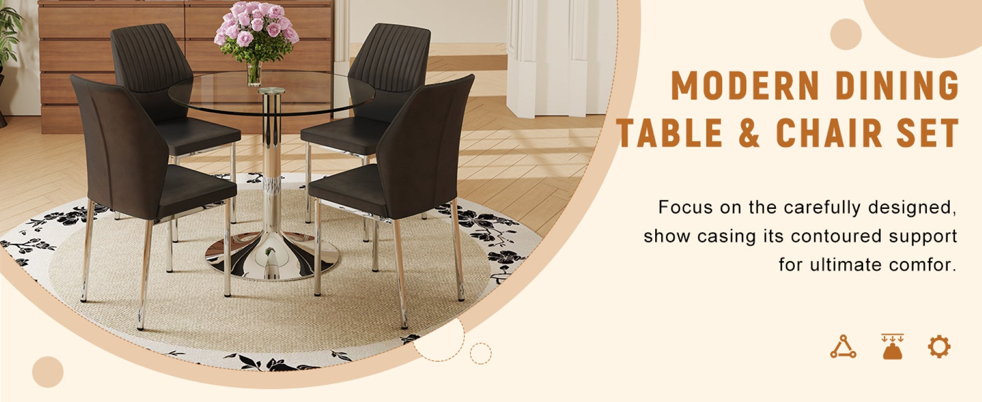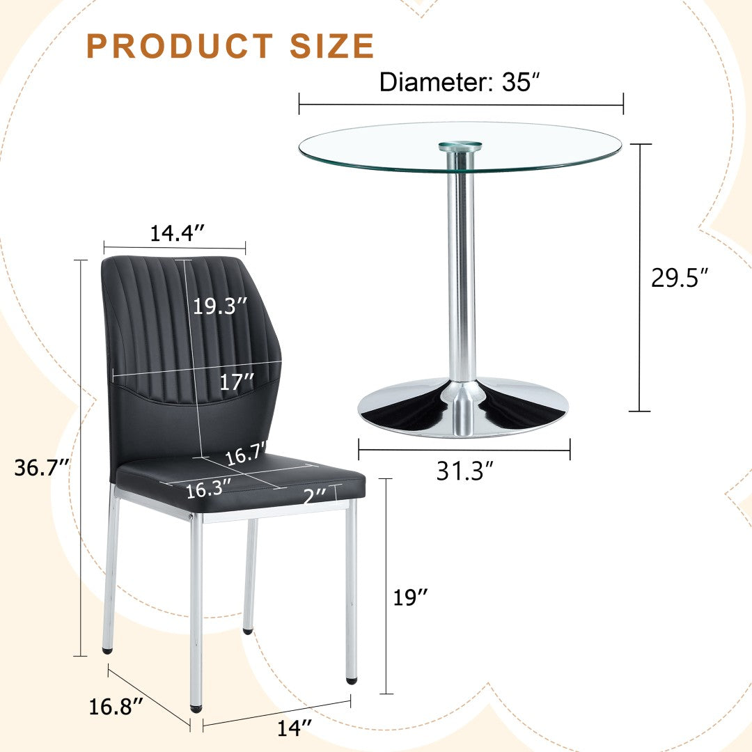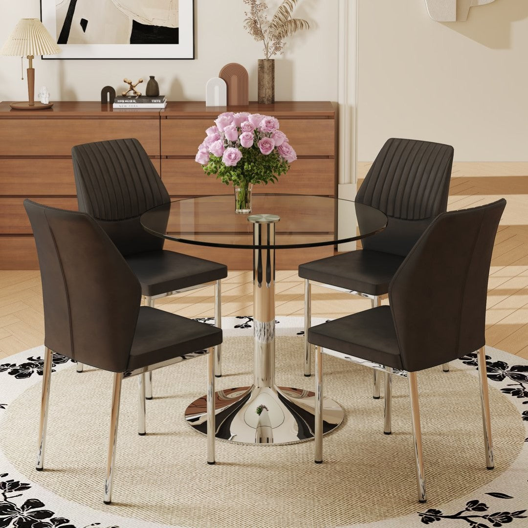Elevate your dining area with this contemporary table and chair set that blends clear tempered glass, sleek silver metal, and comfortable black PU seating. The minimalist round table paired with four high-resilience chairs creates a cohesive, modern look while delivering durable construction and easy maintenance — ideal for everyday family meals or stylish hosting.