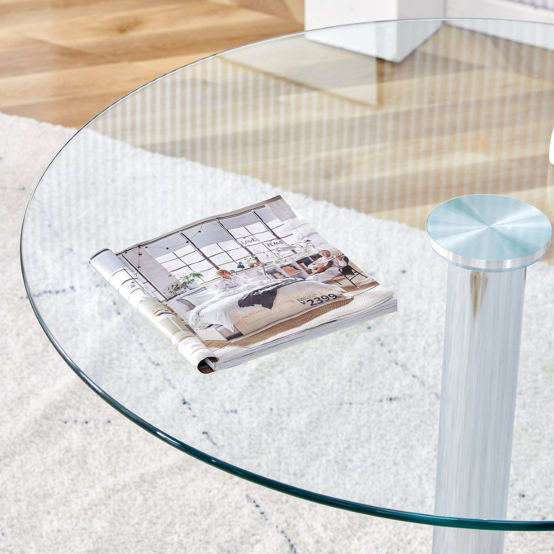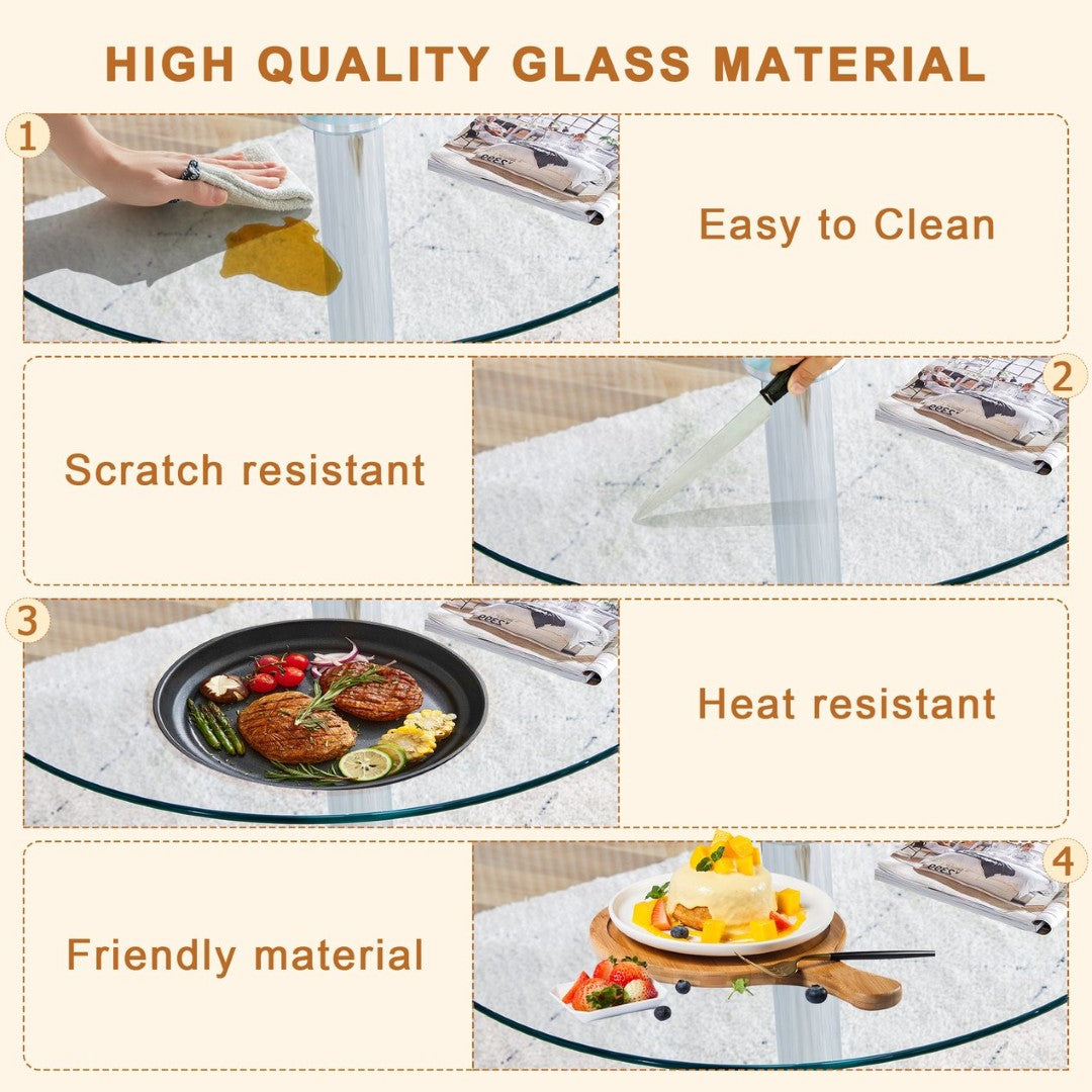 - Spacious Table Top: The round table top with a diameter of 35 inches is made of transparent tempered glass with smooth edges, providing ample dining space suitable for family gatherings and social activities.Stable Support: The cylindrical legs are made of metal with a silver spray coating, paired with a round silver base, providing stable support.