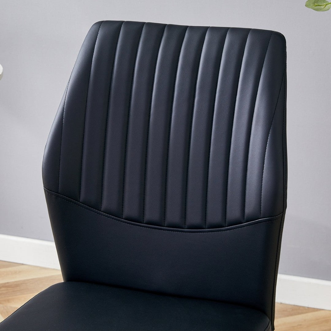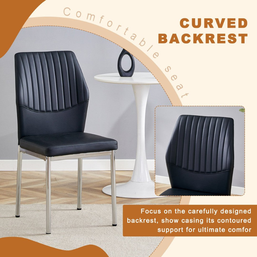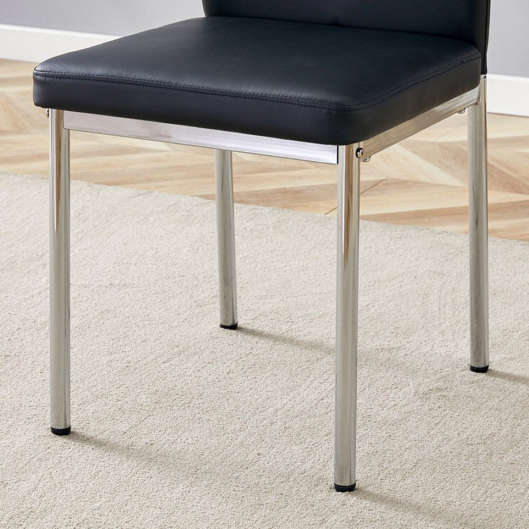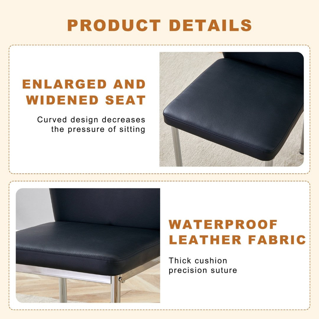 - Chairs — Materials: Black PU synthetic leather upholstery for a faux-leather look, paired with silver metal legs for a coordinated modern finish.