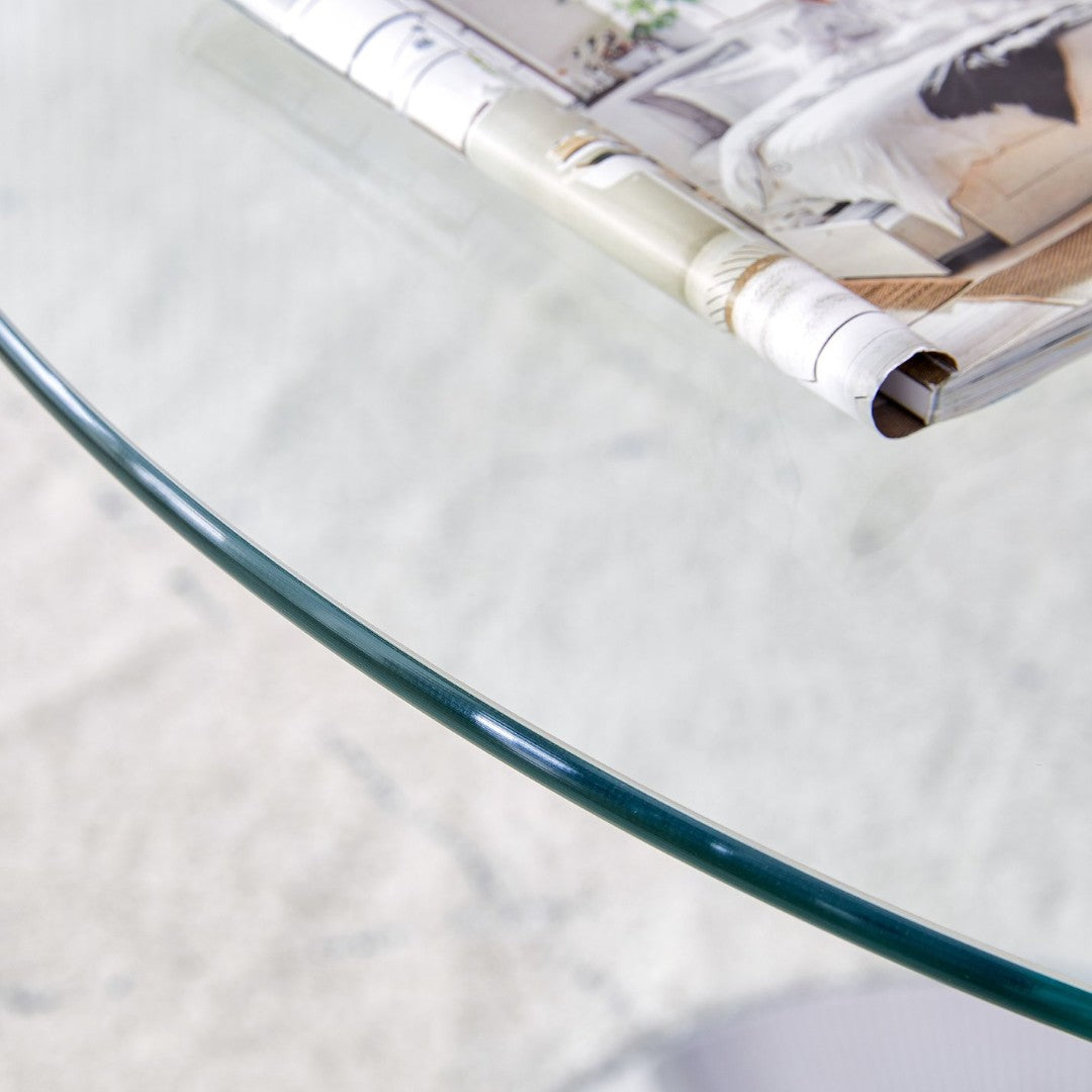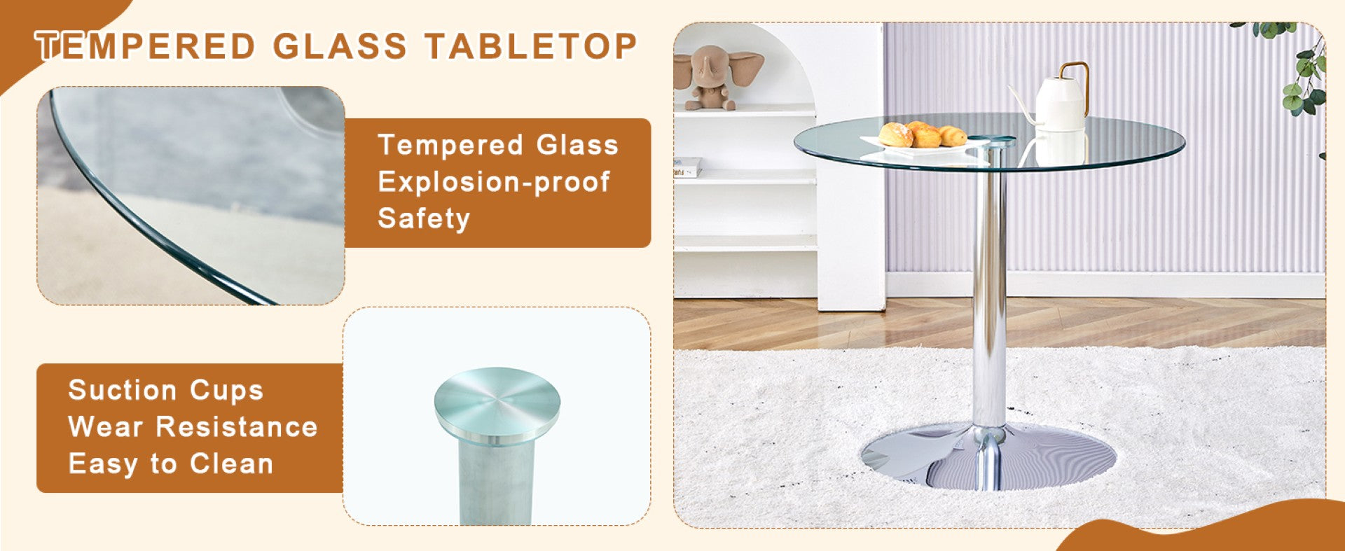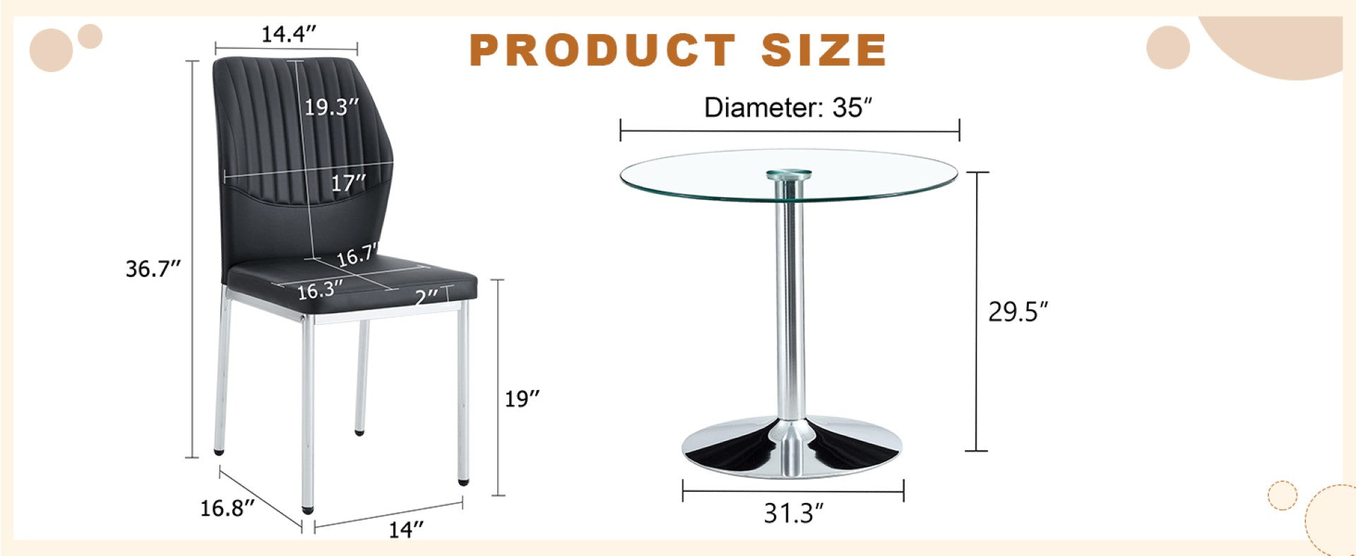 - Table Top: 35" diameter transparent tempered glass with smooth, polished edges for a clean, elegant appearance and easy cleaning.