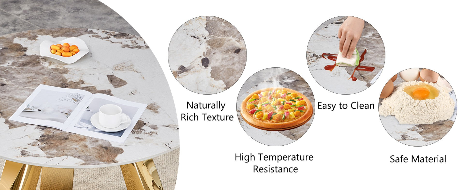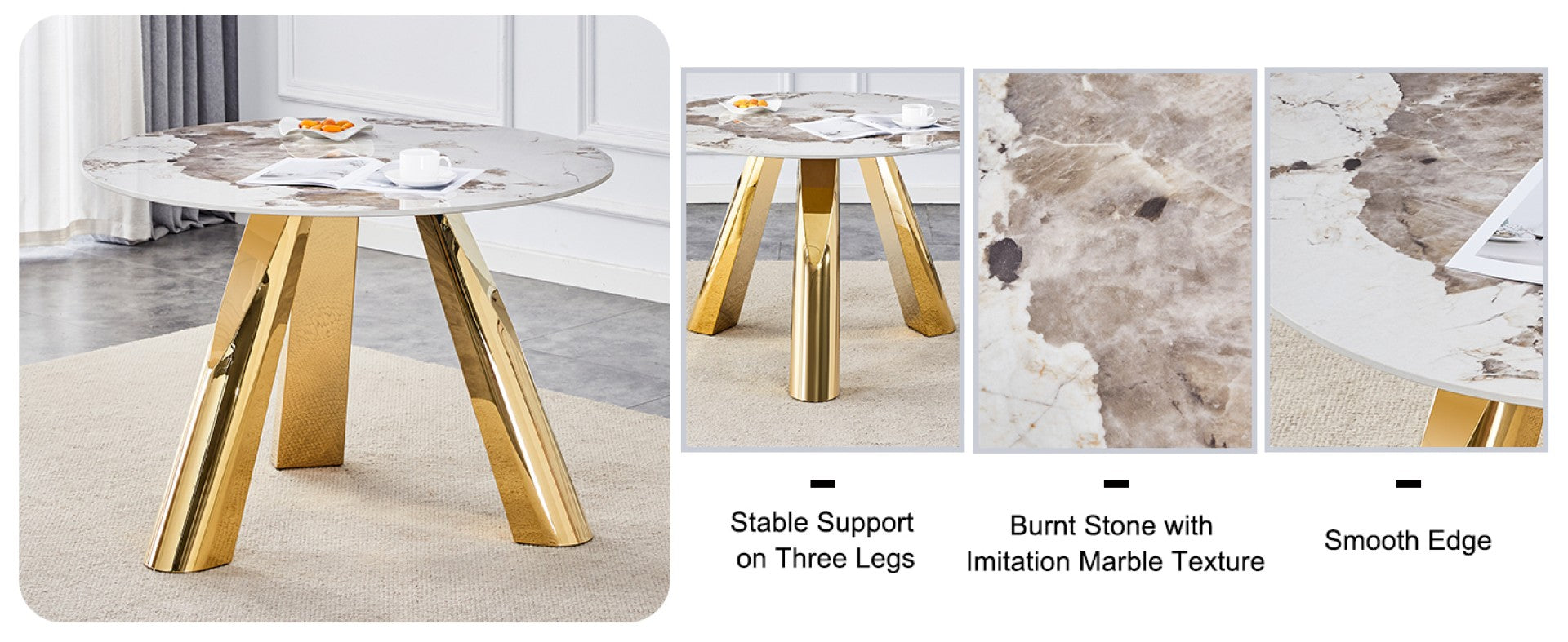 - This dining table boasts an unparalleled elegance with its 42-inch white marble-style vitrified stone top. The unique design of its three high-quality stainless steel gold-plated legs not only offers stability but also adds a touch of luxury, making it the focal point of any dining area