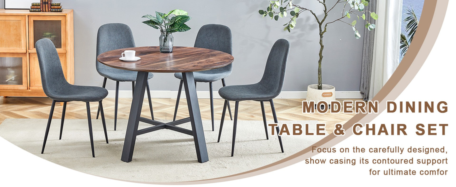 Bring modern minimalist style to your dining area with this elegant round table and four coordinating chairs. The set pairs a warm dark walnut textured tabletop with dark gray linen-cotton upholstered chairs and sleek black metal legs for a cohesive, contemporary look that fits kitchens, dining rooms, offices, and more. Thoughtful ergonomics and sturdy construction make it both comfortable and durable for everyday use.