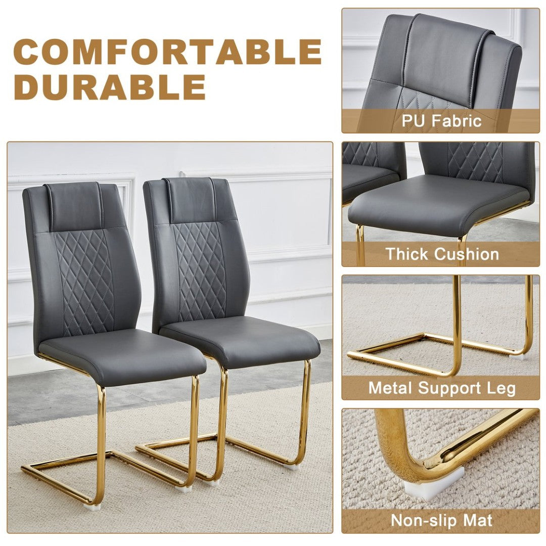 Elevate your dining space with this striking 9-piece set that pairs a luxurious Pandora-patterned glass tabletop and sculptural golden C-shaped legs with eight comfortable dark gray PU chairs. Designed to be both a visual centerpiece and a practical everyday table, the combination of tempered glass, durable MDF, metal accents, and cushioned PU seating creates a refined, modern look that suits dining rooms, open-plan living areas, or studio apartments.
