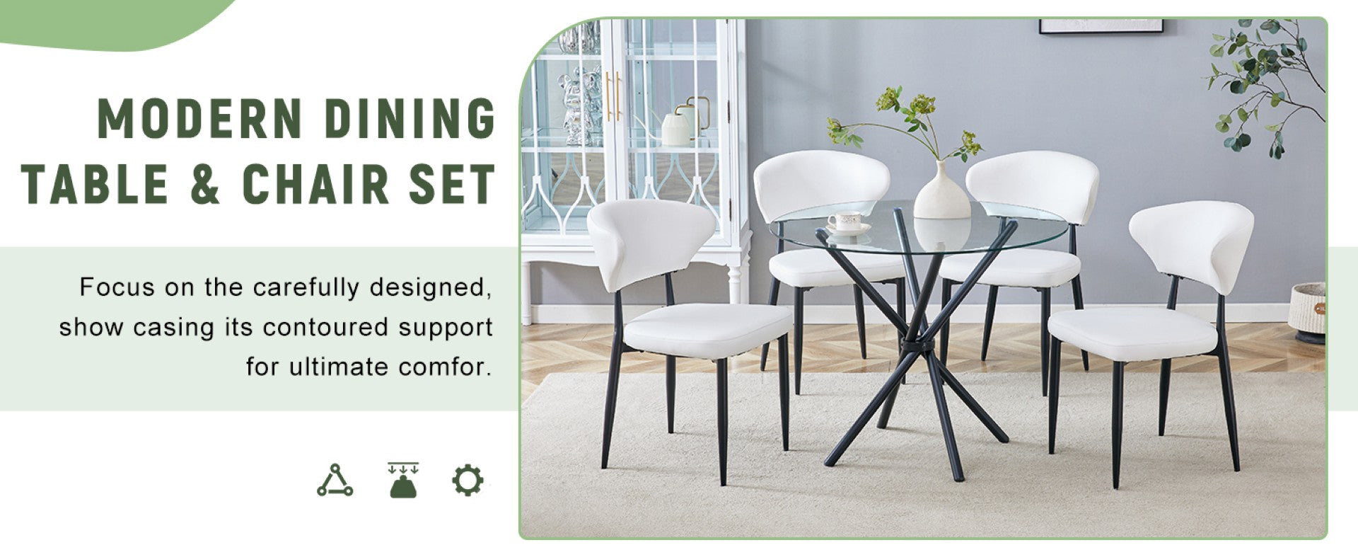 Elevate your dining space with this modern round glass table and four ergonomic white PU chairs. The clean lines and transparent tempered glass tabletop create an open, airy feel, while the curved backrest chairs provide supportive comfort for everyday meals or casual gatherings. This set blends contemporary aesthetics with practical durability for a refined, functional dining solution.