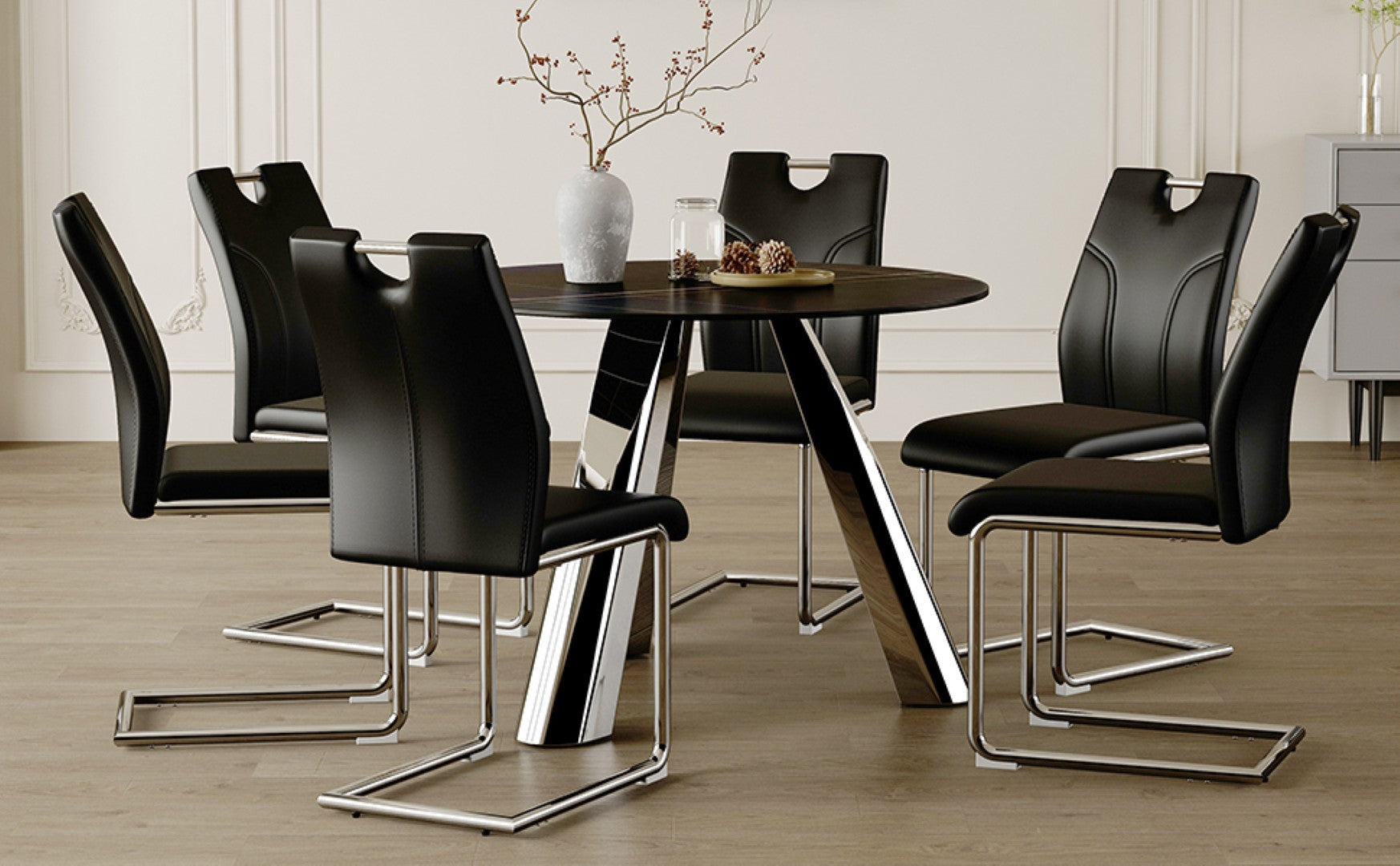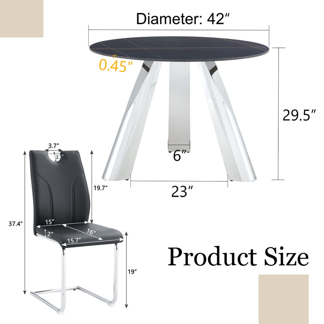 Elevate your dining space with this modern 7-piece set: a 42-inch round sintered stone table supported by stainless steel legs, paired with six ergonomically designed black dining chairs with silver metal legs. The set blends contemporary aesthetics with durable materials for everyday use, offering comfort, easy maintenance, and a refined look that suits apartments, villas, and commercial settings.