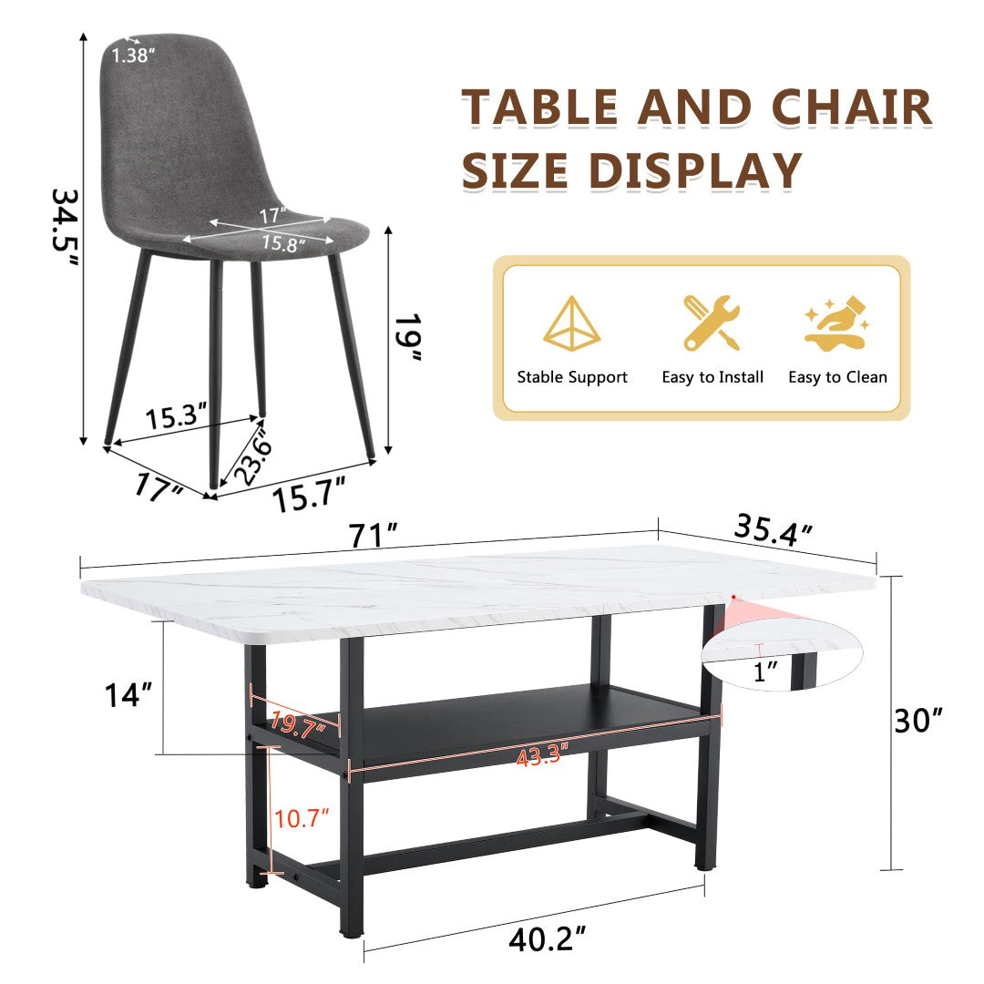 Elevate your dining area with this modern, multifunctional table and chair set that blends minimalist design with practical storage and everyday comfort. The sleek black-grain spliced tabletop, integrated under-table shelf, and six dark gray linen-cotton upholstered chairs create a cohesive look that fits contemporary, Nordic, and industrial interiors while providing durable, comfortable seating for family meals and gatherings.