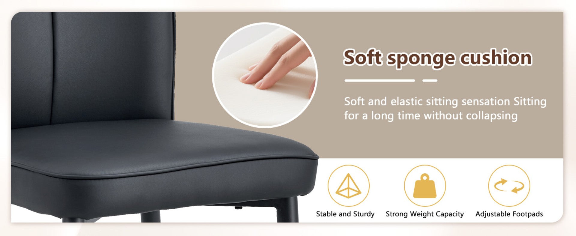 - Chair construction: Four black PU leather chairs with vertical stripe backrest detailing, sponge padding for comfort, and sturdy black metal legs