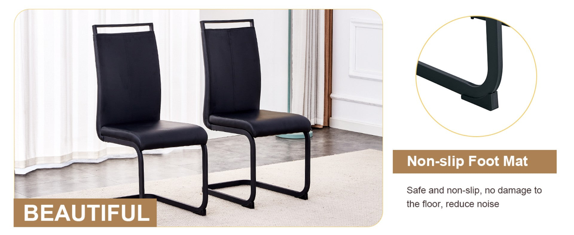 - Chair legs: Arched black metal legs that combine style with solid support; anti-slip protective feet to prevent floor scratches