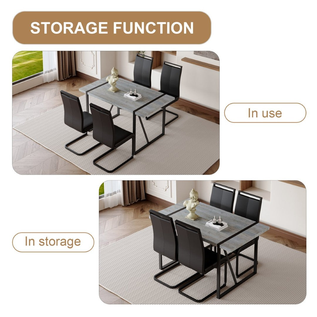 - Color & materials: Light gray tabletop, black frame and chairs; materials: MDF, metal, PU leather