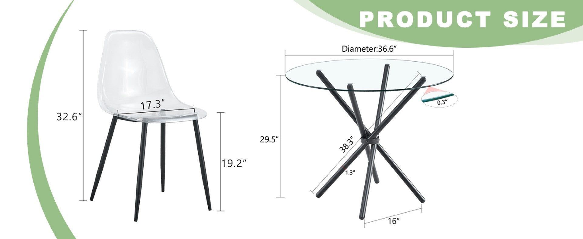- Anti-slip Foot Pads: All chair legs are equipped with anti-slip foot pads to ensure stability and safety during use.Easy to Clean: The tempered glass top and transparent plastic material are easy to clean and maintain, suitable for today's busy lifestyles.