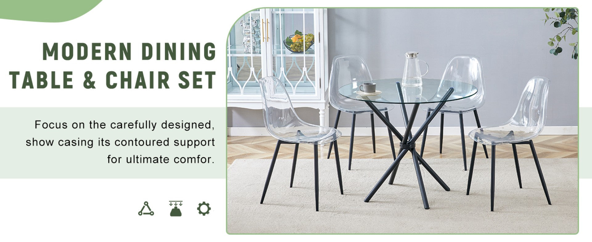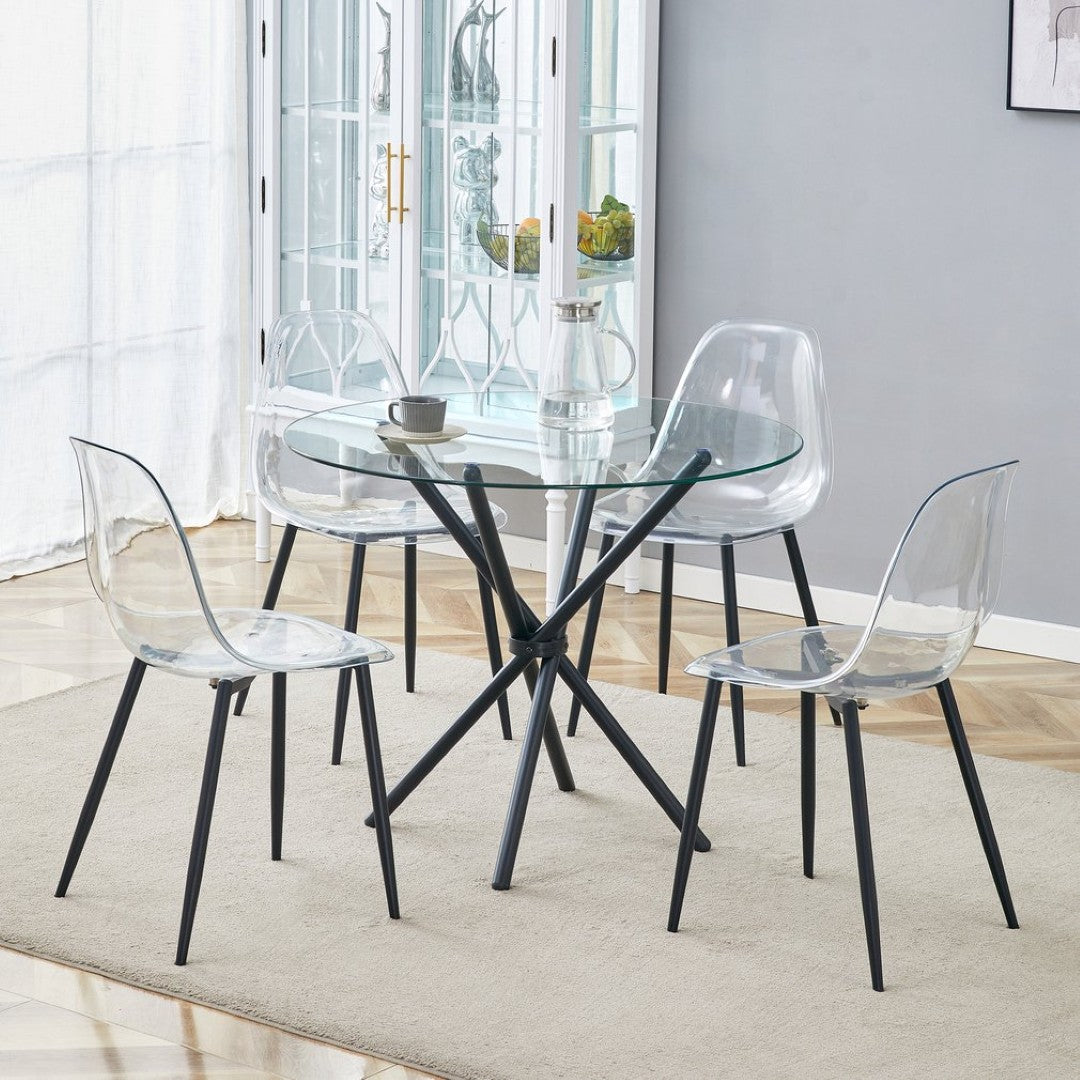Elevate your dining space with this modern, minimalist table and chair set that blends transparent materials with matte black metal for a light, contemporary look. The round tempered glass table and four matching transparent chairs create an open, airy feel while providing durable, easy-to-clean surfaces and stable, thoughtfully engineered bases for everyday use and casual entertaining.