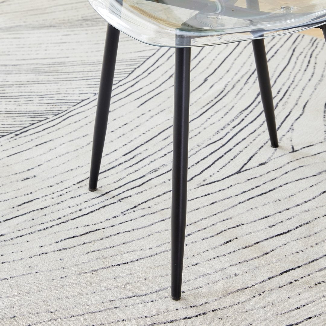 - Transparent plastic Cushions: The dining chairs are made of transparent plastic material with an integrated cushion and backrest, offering comfort and a contemporary aesthetic.