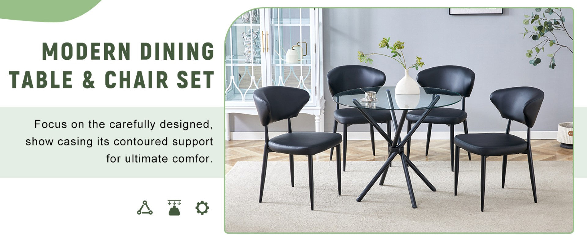 Elevate your dining space with this modern, minimalist table and chair set that blends transparent tempered glass and sleek black finishes for a clean, contemporary look. Thoughtfully engineered for comfort, durability, and easy maintenance, the set includes a round glass table and four ergonomically designed PU leather chairs—ideal for everyday meals or stylish entertaining.