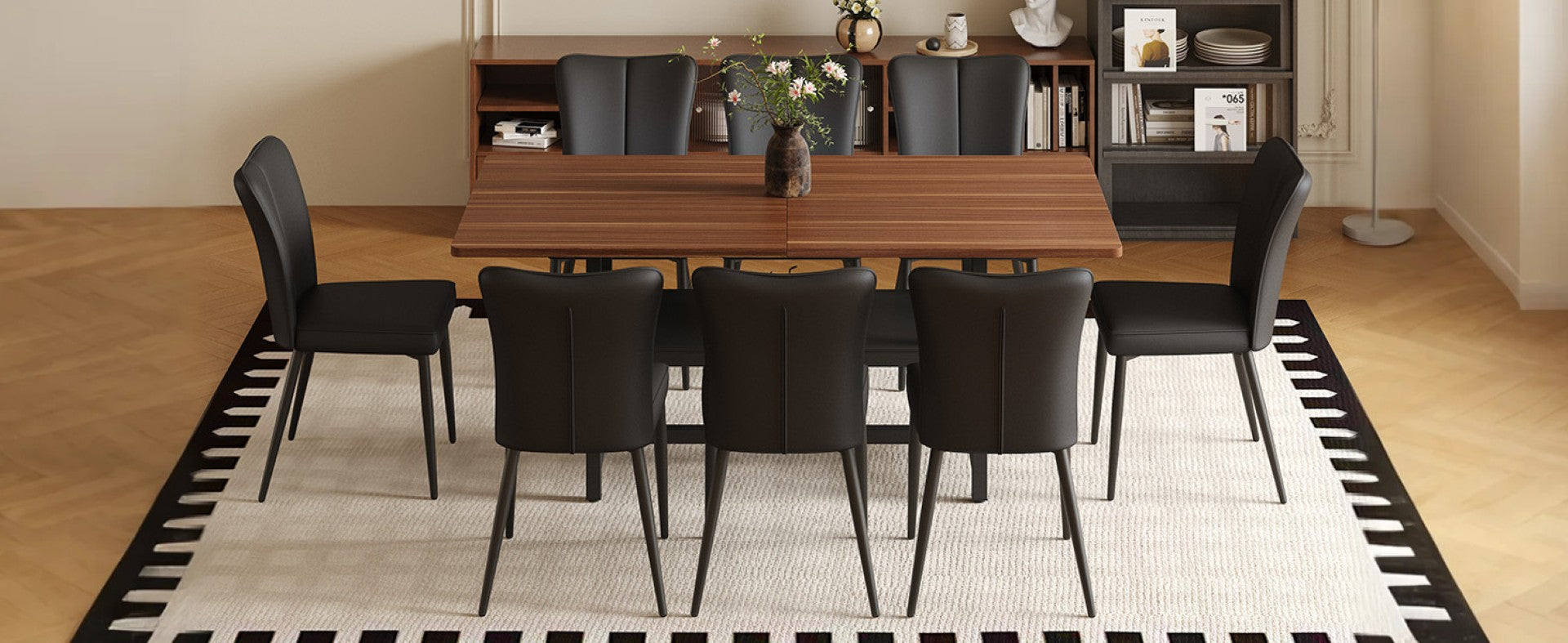 Bring modern elegance and everyday practicality to your dining space with this walnut-grain table and eight black PU chairs. Clean lines, a warm textured tabletop, and ergonomic seating combine to create a cohesive set that suits contemporary, Nordic, and industrial interiors while offering durable surfaces and comfortable dining for family and guests.