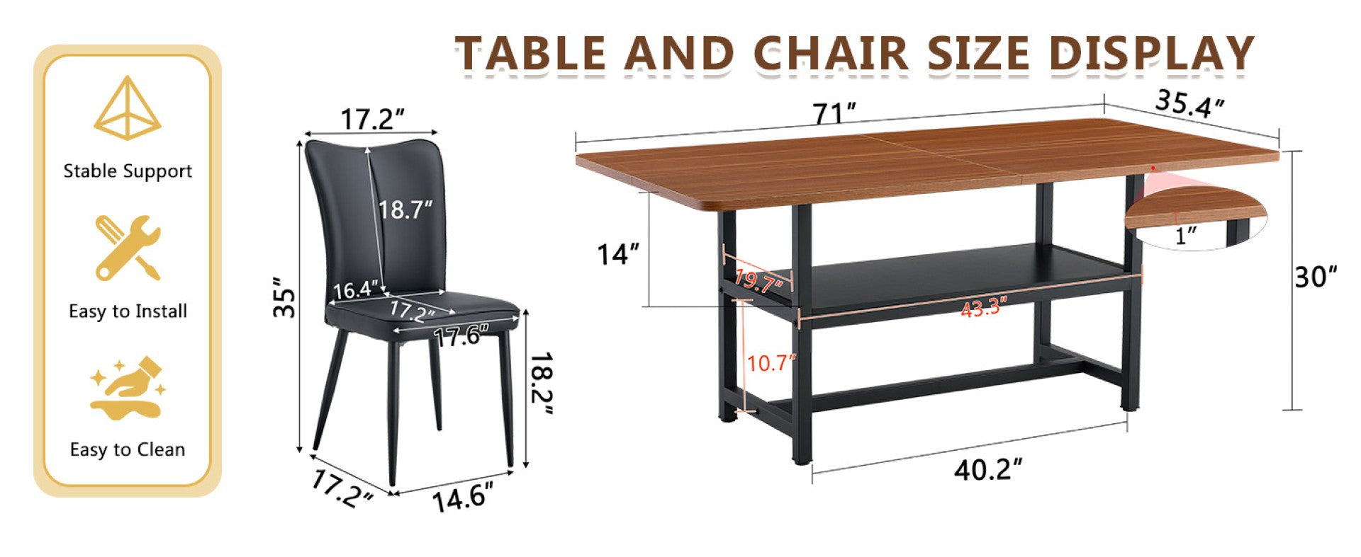 - Materials: MDF tabletop with walnut texture, metal frame/legs, breathable PU leather upholstery, and high-density sponge fill in seats