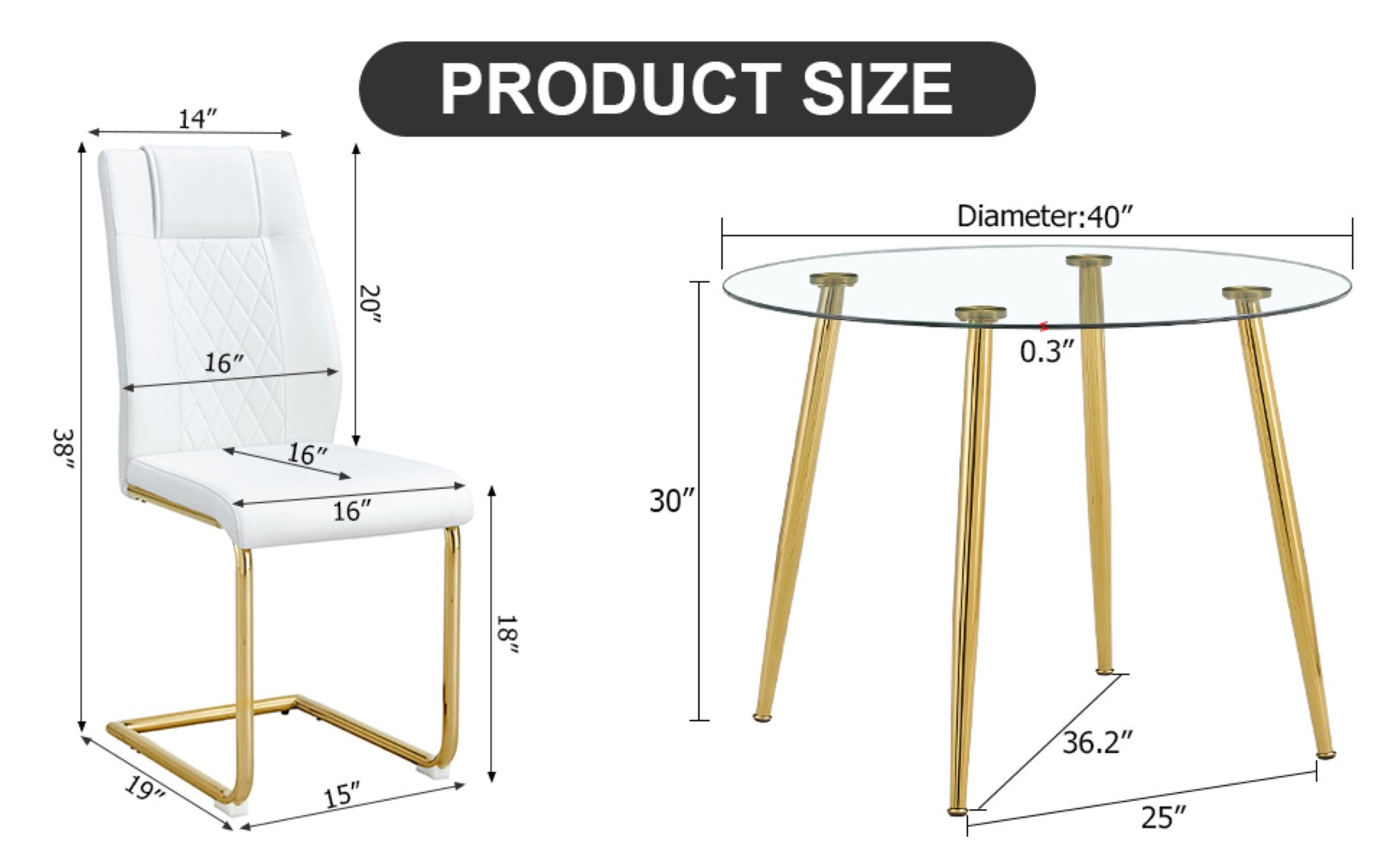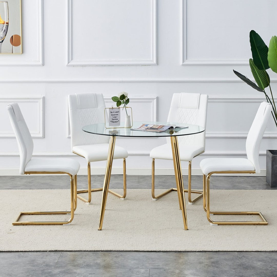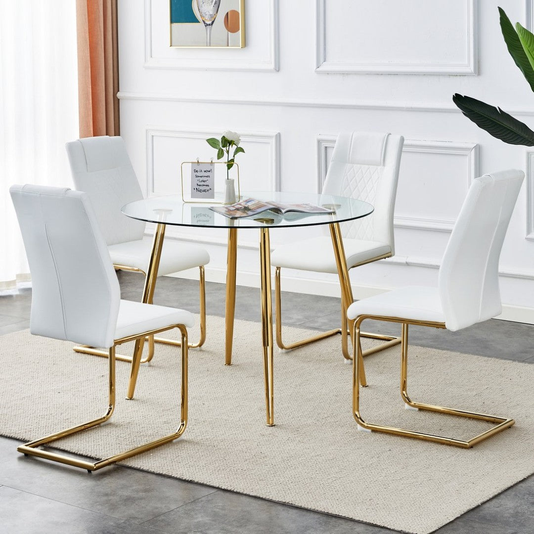 Bring modern elegance to your dining space with this chic circular dining set. A sleek 40-inch glass tabletop paired with gold-plated metal legs creates a luminous focal point, while four white PU-cushioned chairs provide comfortable, stylish seating—ideal for intimate family meals or entertaining in smaller dining areas.