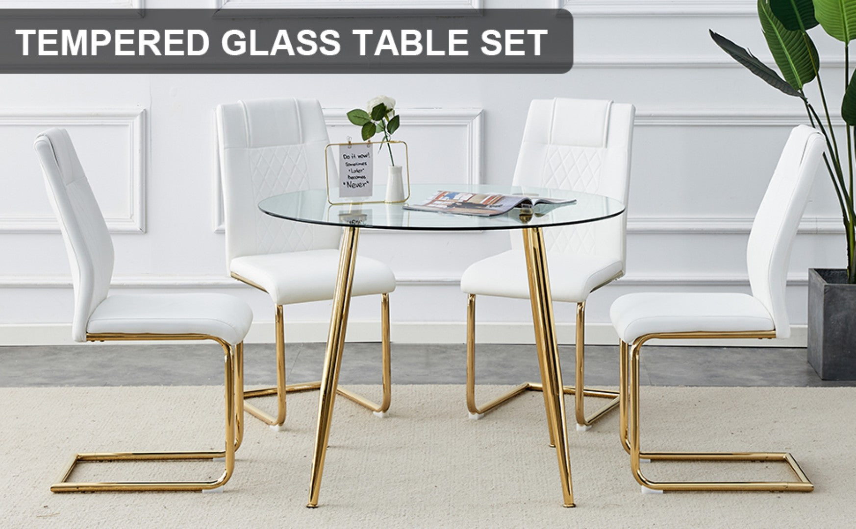 - Materials & finish: Tempered glass tabletop with gold-plated metal legs; chairs feature gold-plated metal legs and white PU upholstered cushions for a luxe look.