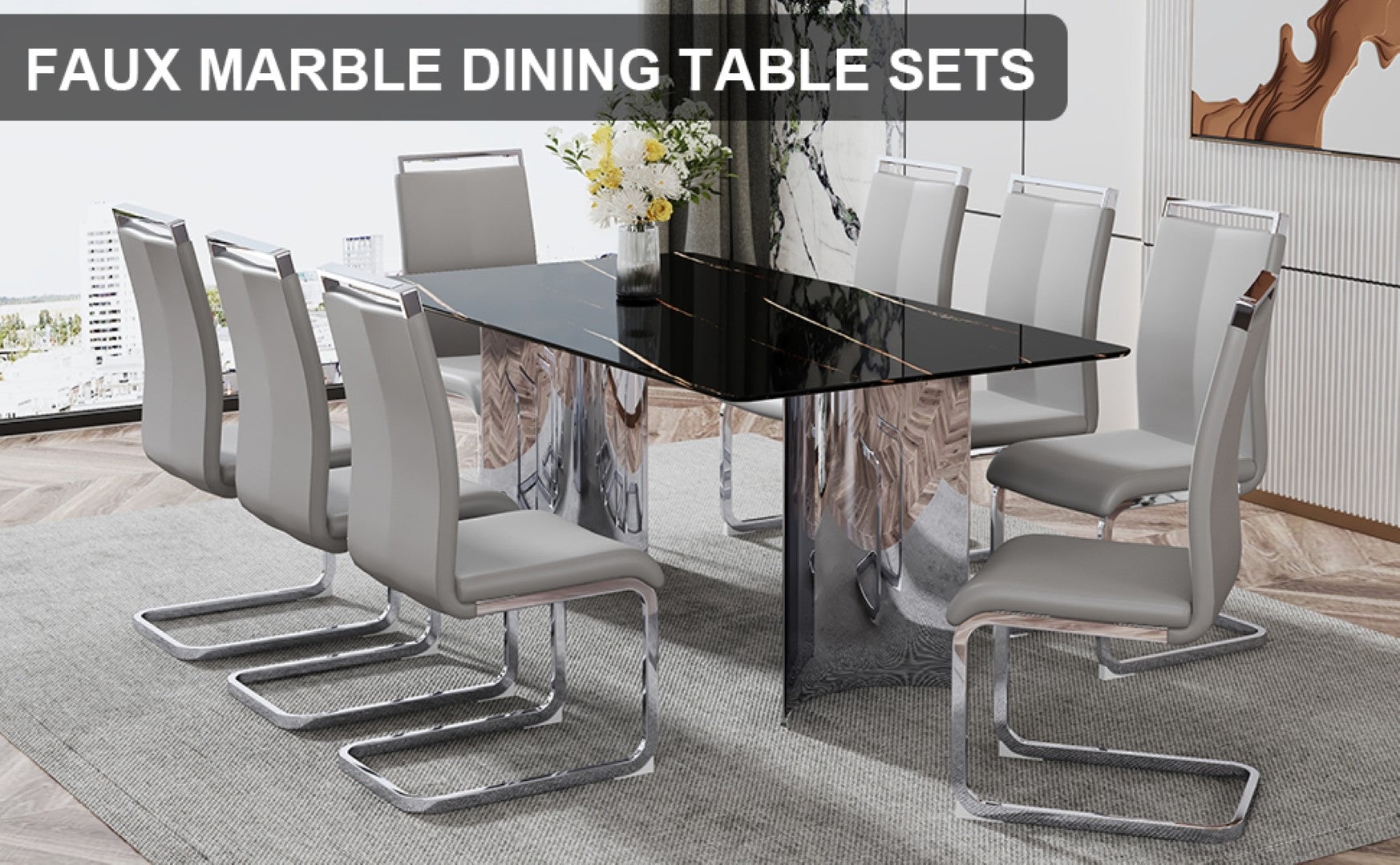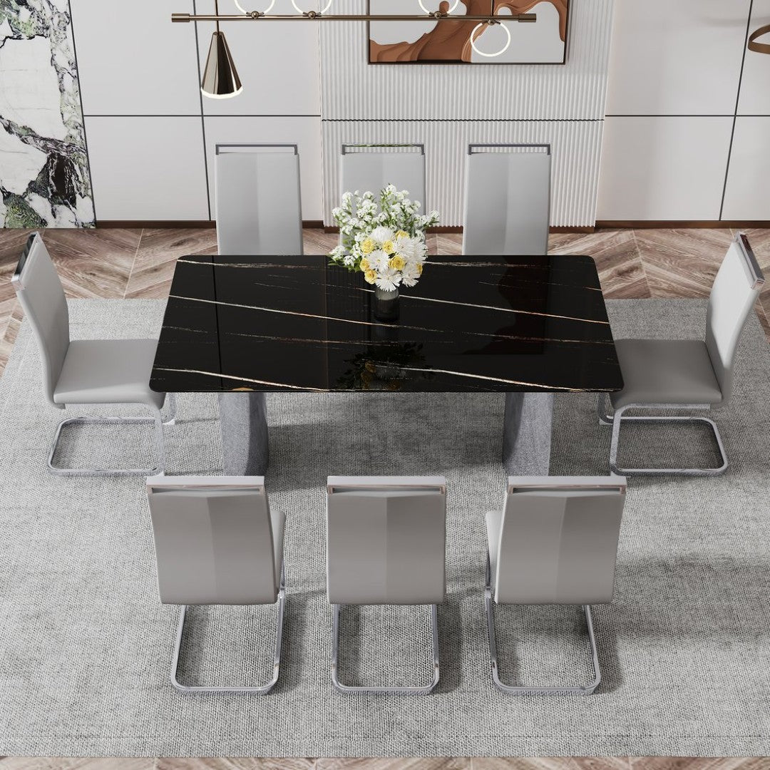 Add contemporary elegance to your dining or entertaining space with this sleek table and 8-chair set. The tempered glass tabletop features a refined black marble-pattern decal that mimics natural stone while remaining durable and easy to maintain. Complemented by polished silver stainless-steel legs and light-gray PU-upholstered chairs with curved metal C-tube legs, the set balances modern style, everyday comfort, and practical durability—ideal for family meals, gatherings, or presentation use.