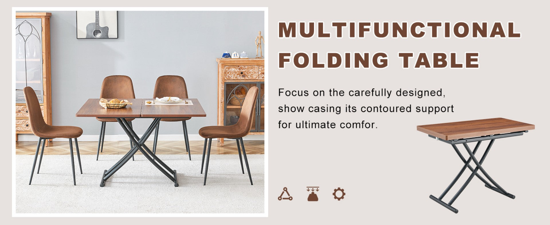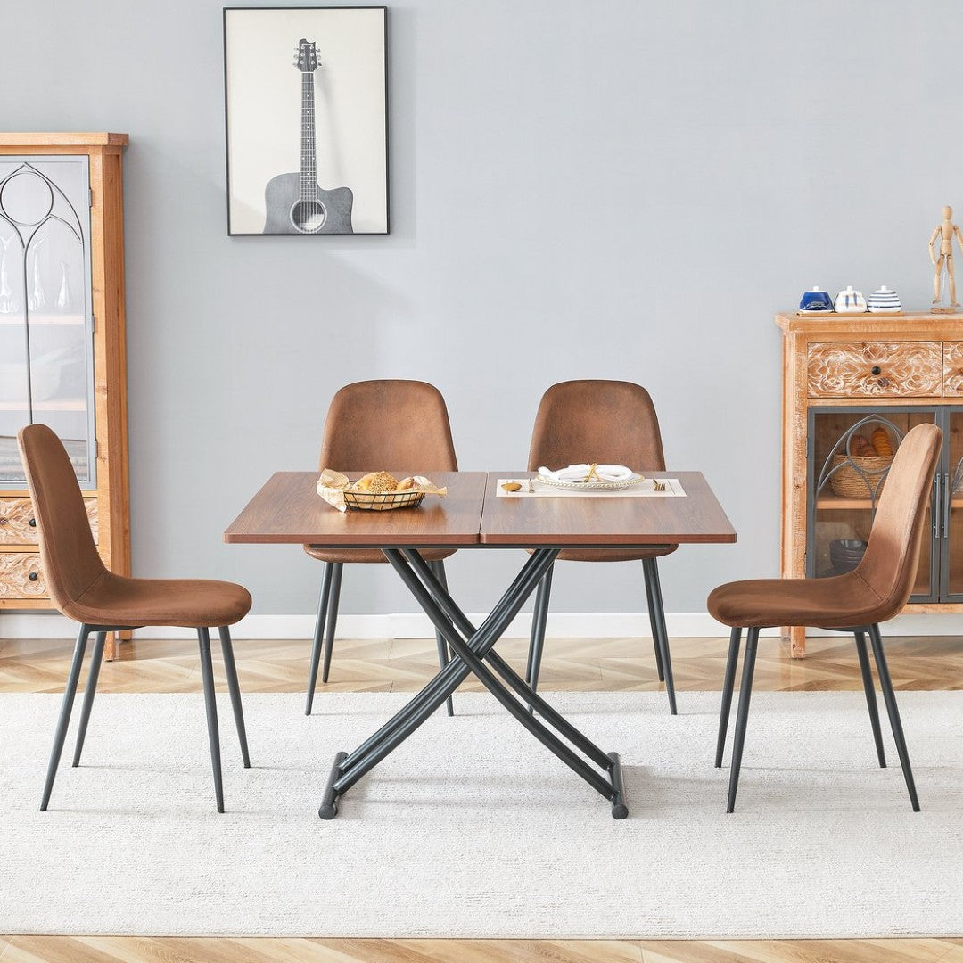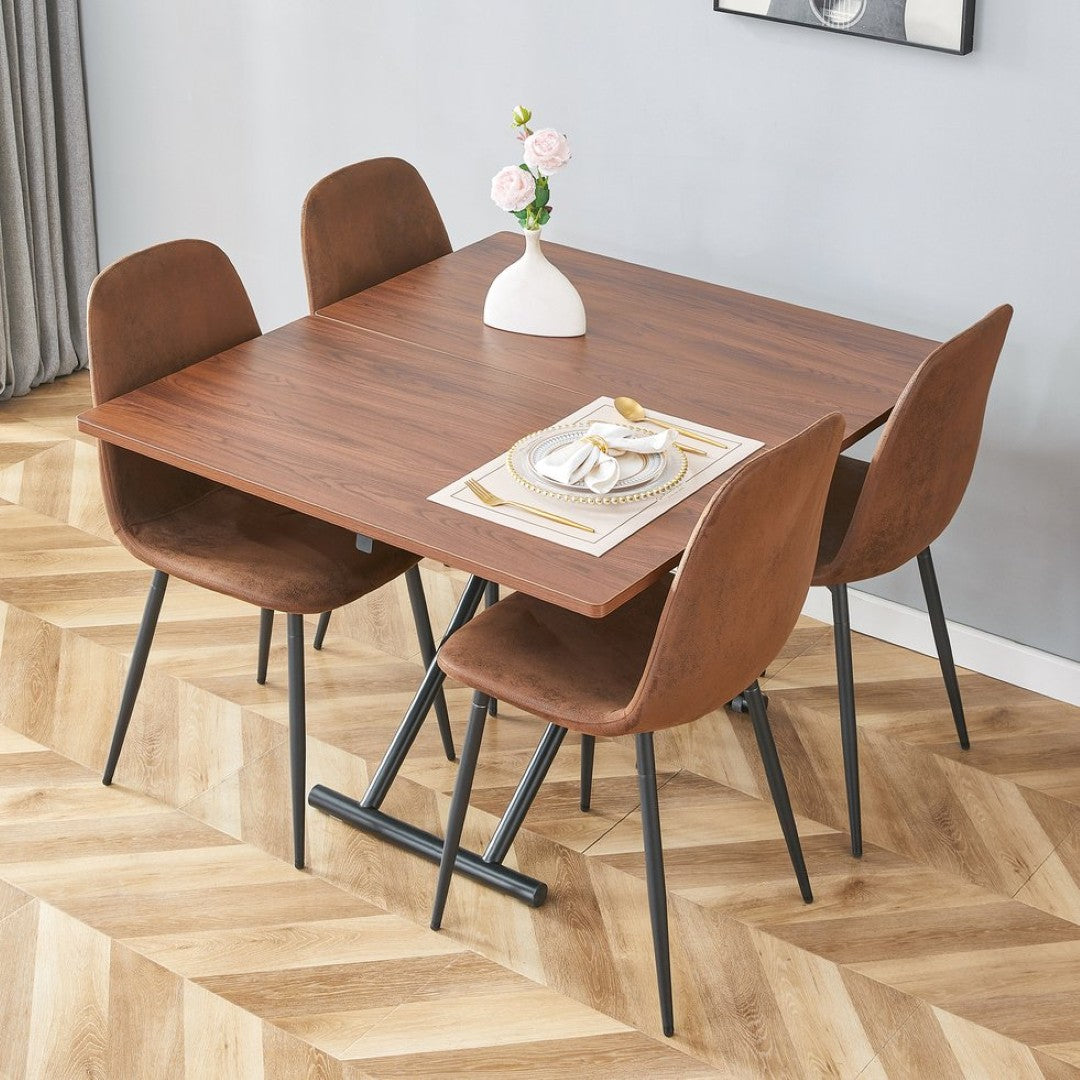 Enjoy versatile, modern design and everyday comfort with this multifunctional table and 4-chair set. The walnut-textured MDF tabletop and coordinated brown techno-fabric chairs create a warm, contemporary look while the adjustable lifting table adds practical flexibility for dining, work, or leisure. Built with sturdy black metal legs and thoughtful ergonomic details, this set balances style, comfort, and stability for any living space.