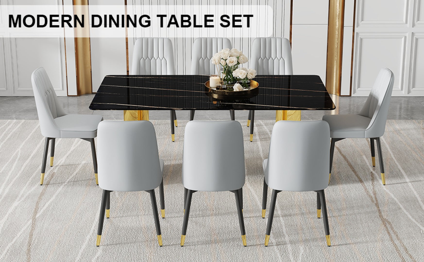 A refined dining ensemble that blends contemporary elegance with everyday practicality — this set features a sleek glass tabletop finished with a realistic imitation marble pattern and warm golden stainless-steel legs, paired with eight modern light-gray dining chairs upholstered in soft PU with sturdy black metal legs. Designed for family meals, entertaining, or as a striking statement in open-plan spaces, the set balances durable construction with comfortable seating and easy maintenance.