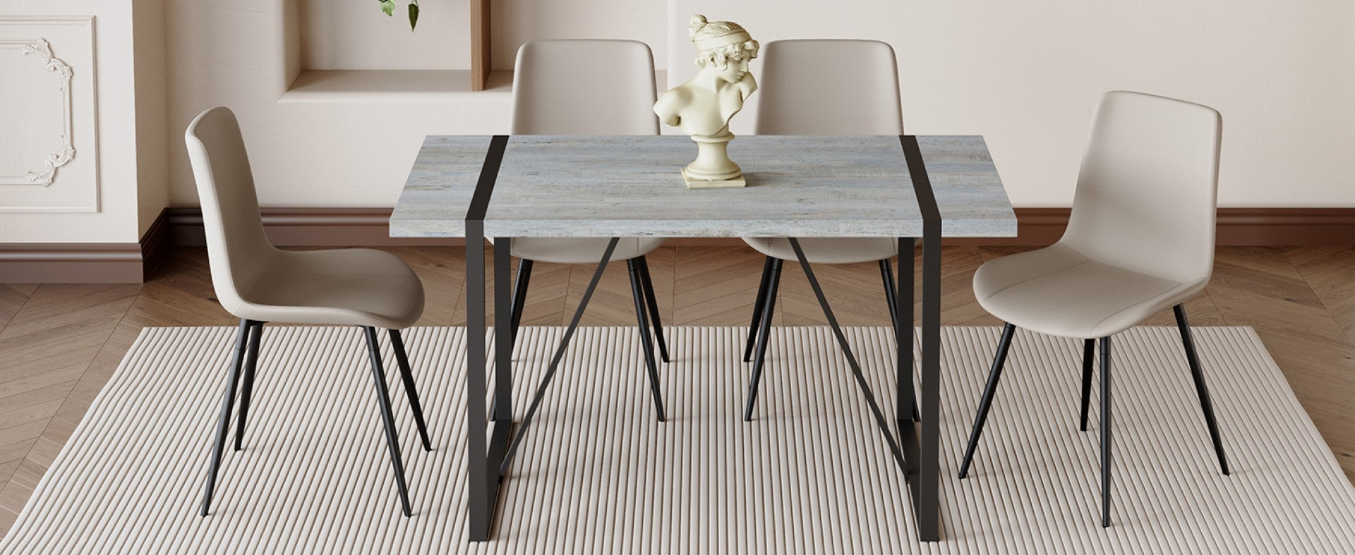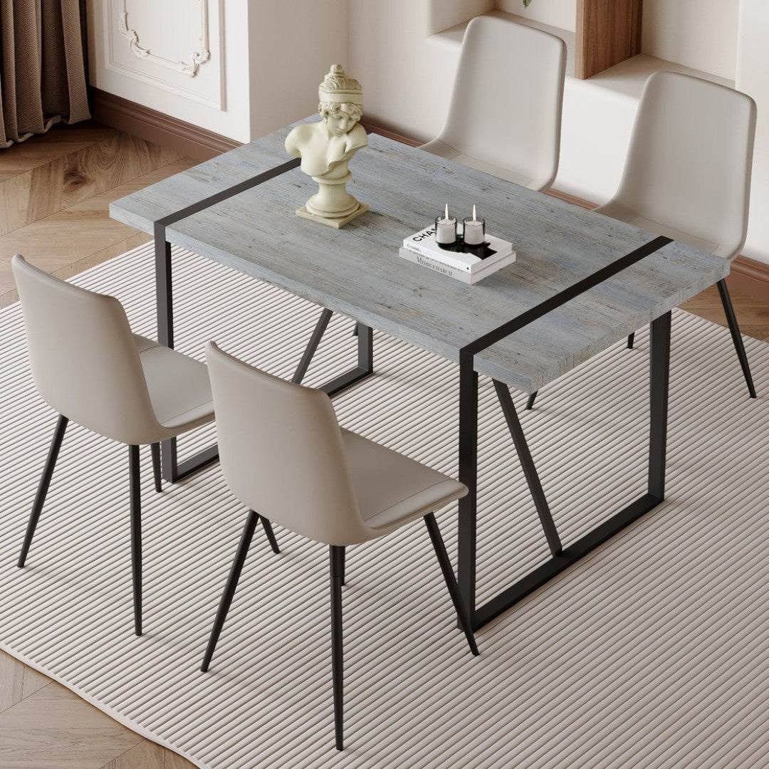 Bring modern minimalism to your dining space with this sleek table and chair set. The grey marble-textured MDF tabletop and matte black metal frame create a refined, contemporary look, while the cushioned PU seats deliver everyday comfort. Designed for quick assembly and low maintenance, this set suits compact dining areas, kitchens, bistros, or home offices that favor clean lines and durable materials.