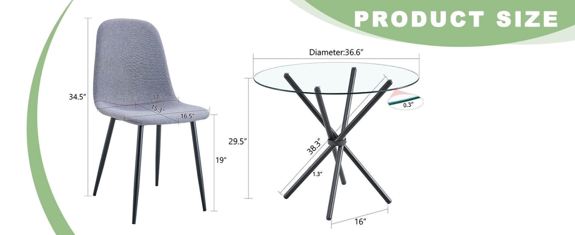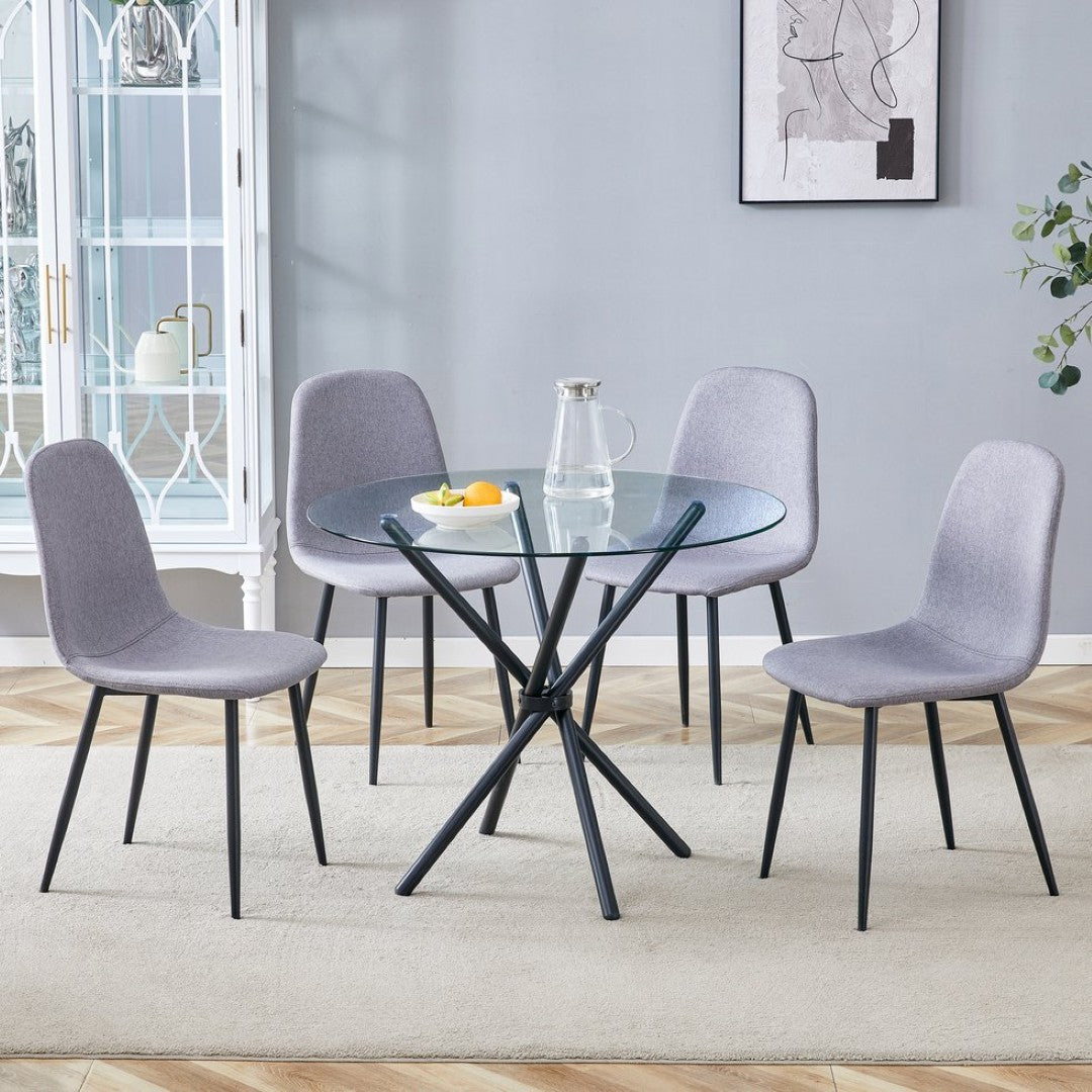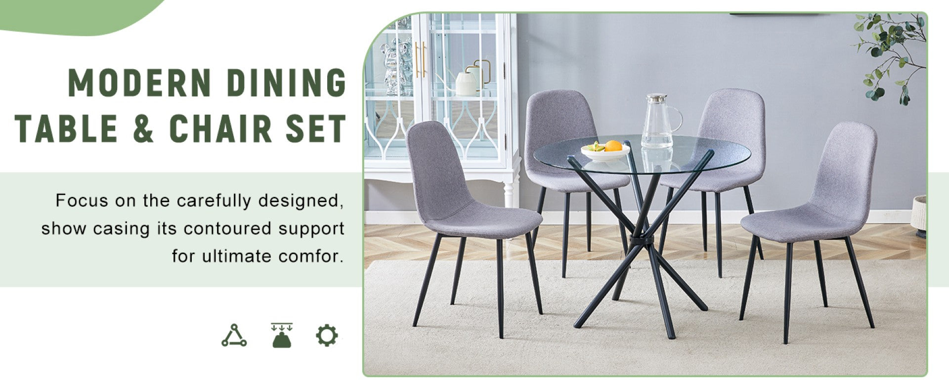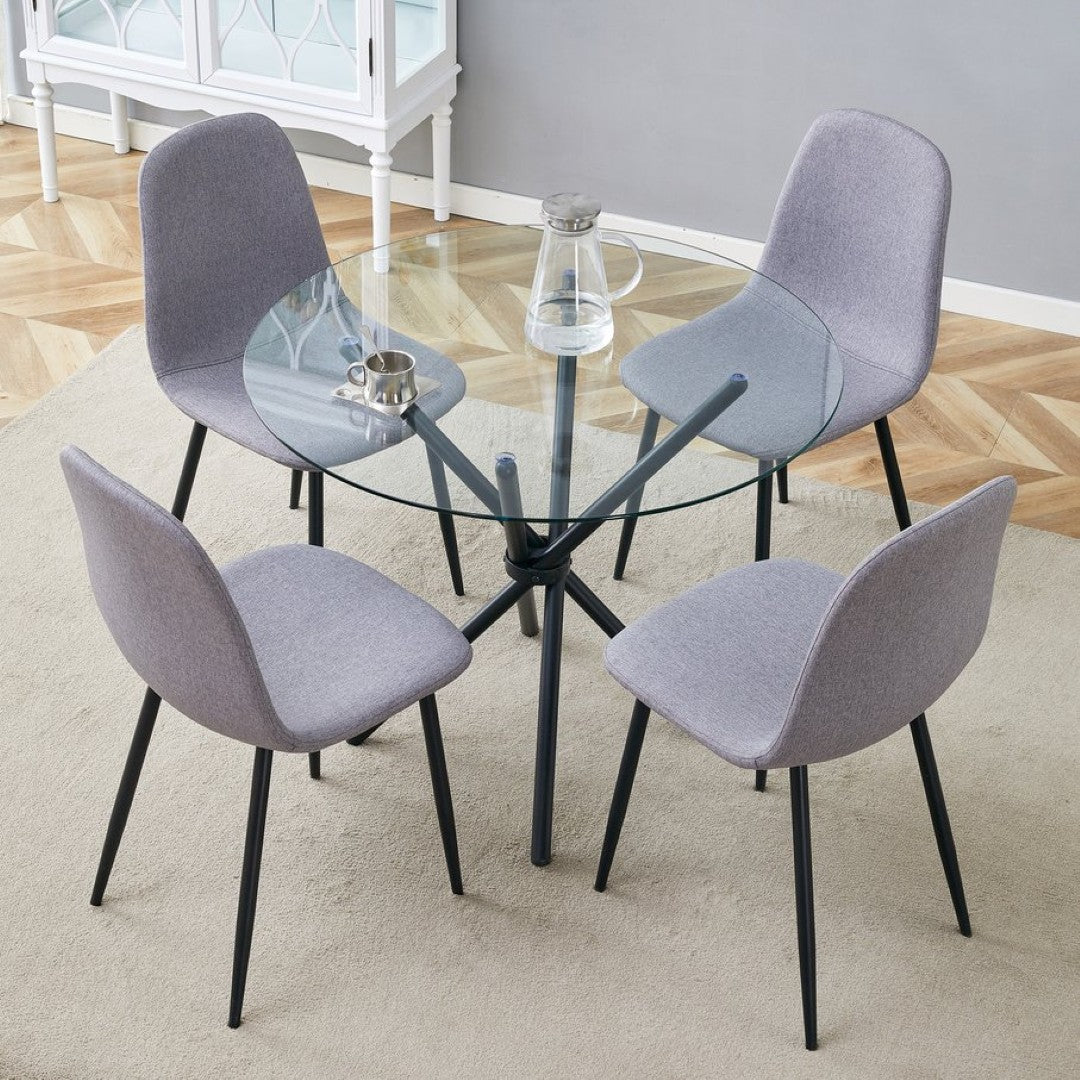 A sleek, modern dining set that blends transparent tempered glass with light gray linen chairs for a clean, contemporary look. Ideal for small dining rooms, breakfast nooks, or stylish commercial spaces, this set balances elegant simplicity with durable construction and everyday comfort.