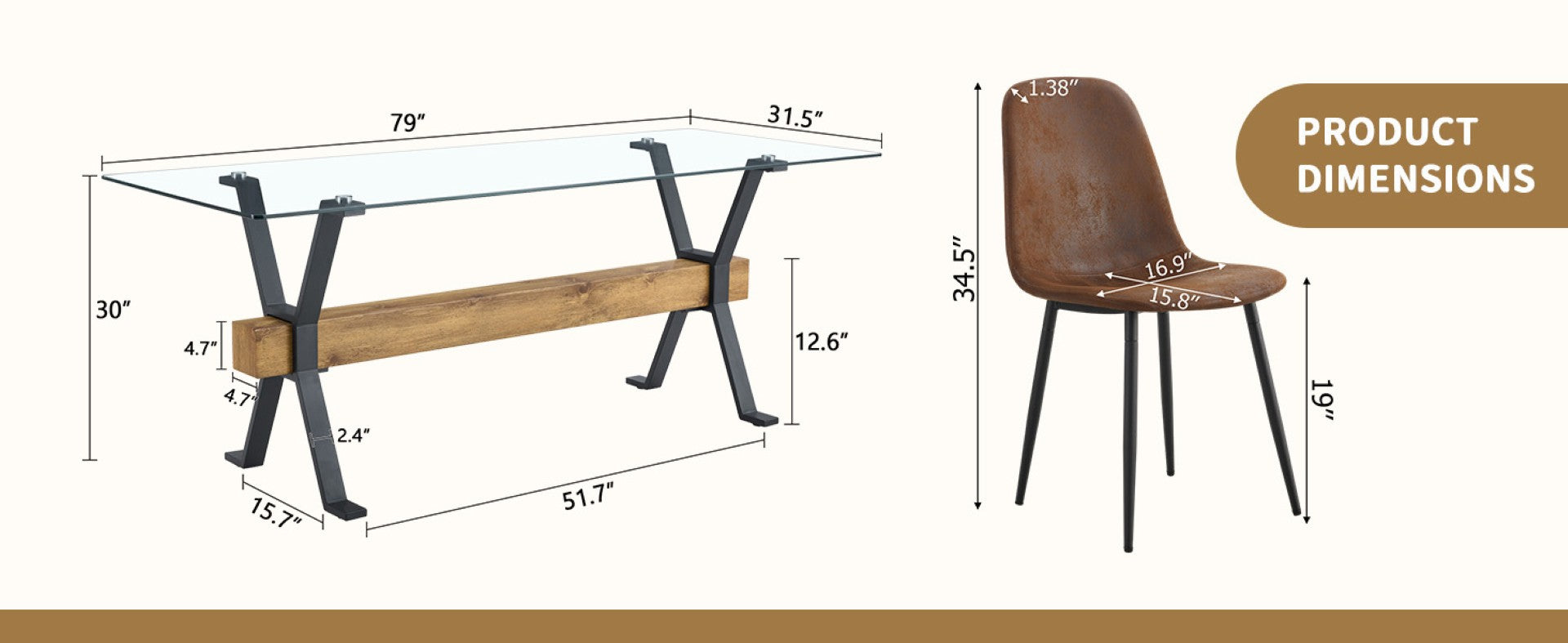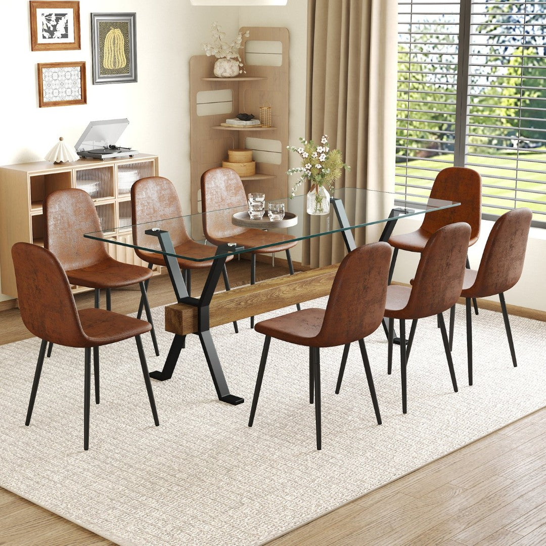 Elevate your dining space with a modern, minimalist table and chair set designed for comfort, durability, and easy maintenance. The clear tempered glass tabletop and wood-grain accents create an elegant yet approachable look, while the supportive X-shaped metal frame and eight upholstered techno-fabric chairs deliver reliable stability and everyday comfort for family meals or gatherings.