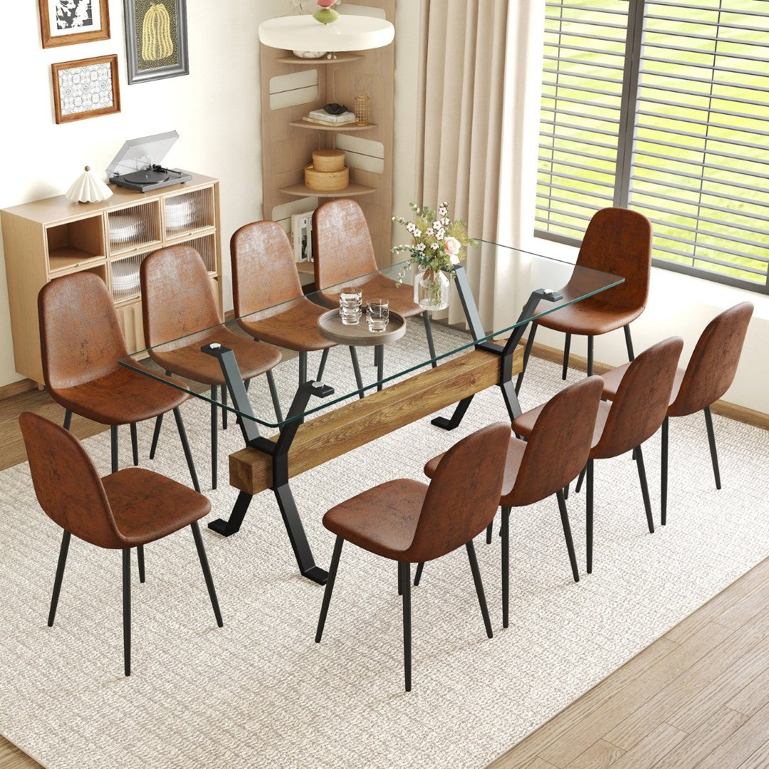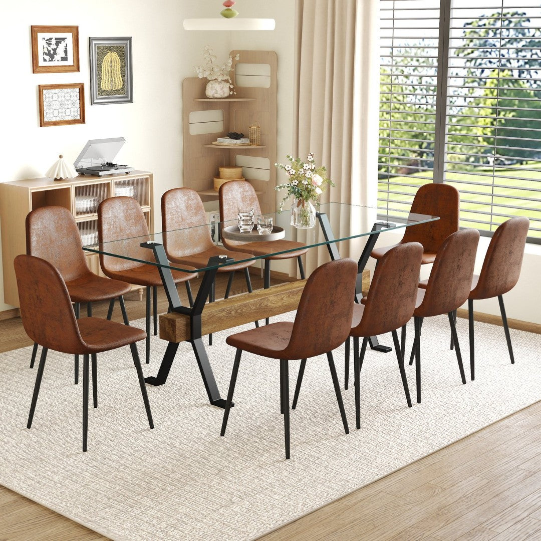 Invite modern elegance to your dining space with this spacious glass-top table and comfortable 10-chair set. The large transparent tempered glass tabletop and sturdy X-shaped metal base combine contemporary style with everyday durability, while the warm brown techno-fabric chairs provide breathable, ergonomic seating for long meals and gatherings. Thoughtfully designed details—wood-grain textured MDF crossbeam, anti-slip feet, and powder-coated metal legs—ensure stability and a refined finish.
