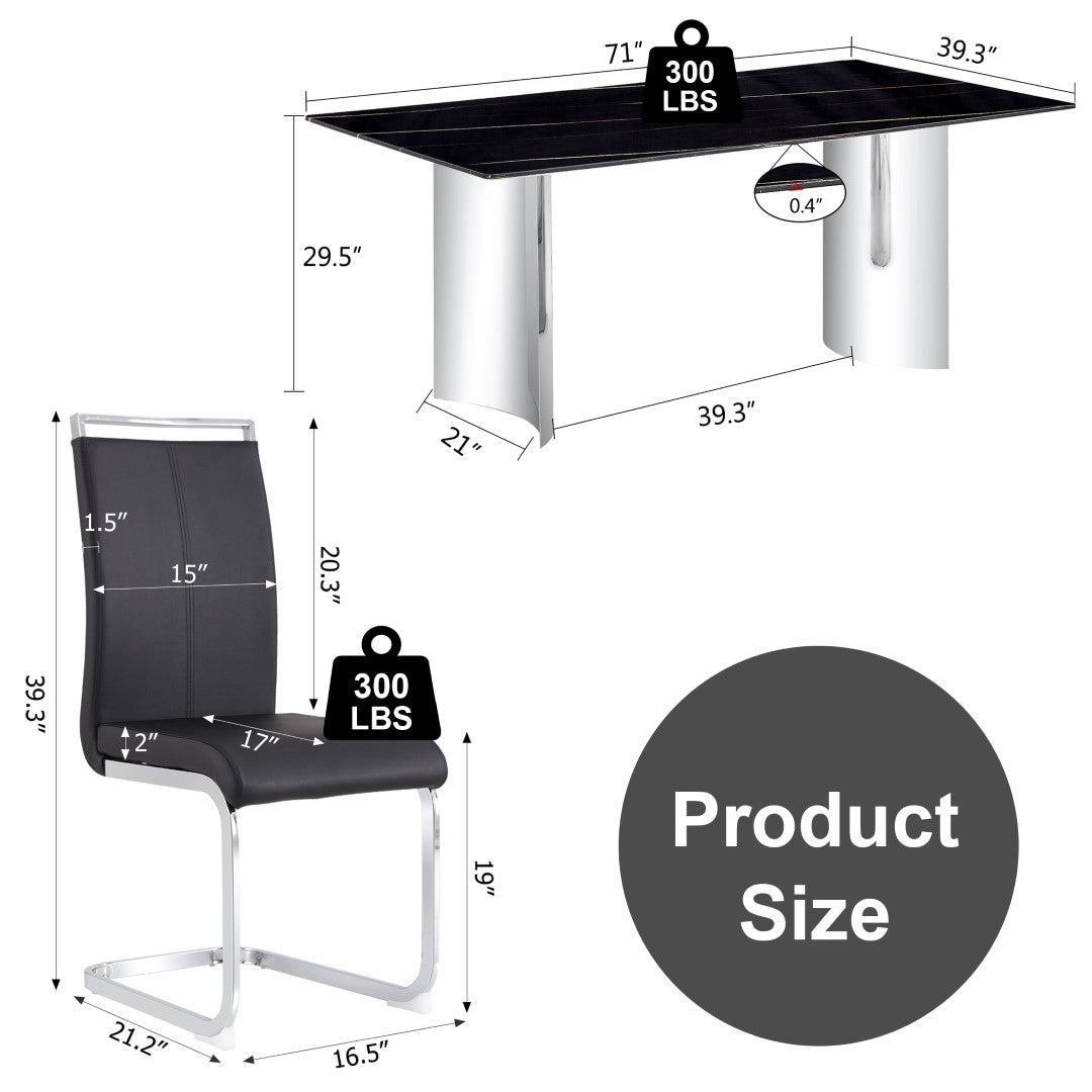 Elevate your dining and entertaining space with this contemporary table and 6-chair set that blends modern materials with practical design. The tempered glass tabletop features a black marble-pattern sticker for a luxe look, while silver stainless-steel and curved C-tube legs create a cohesive, stylish profile. Designed for everyday use and special occasions, this set delivers comfort, durability, and easy maintenance.