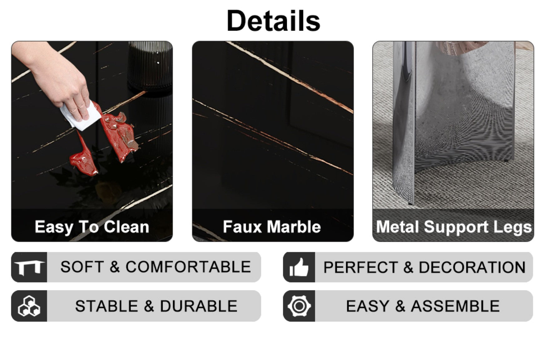 - Tabletop: Tempered glass with black marble-pattern sticker — high transparency, scratch-resistant surface, easy to clean, and adds a modern, elegant finish