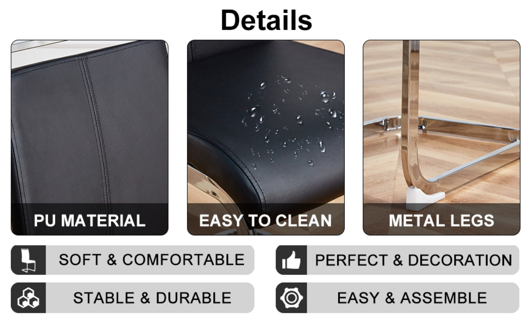 - Chairs: High-quality black PU seats offering soft comfort and good elasticity for prolonged sitting; wear-resistant and easy to maintain