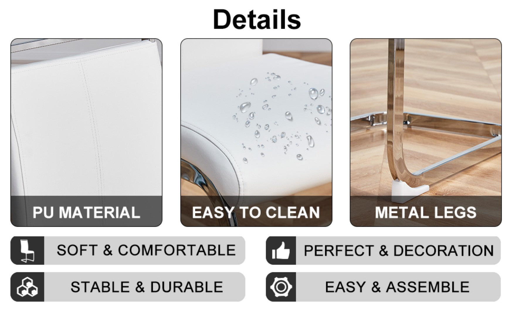 - Materials: Tempered glass tabletop with black marble-pattern sticker; stainless steel table legs; white PU upholstery on chairs; silver C-tube/arched metal chair legs.
