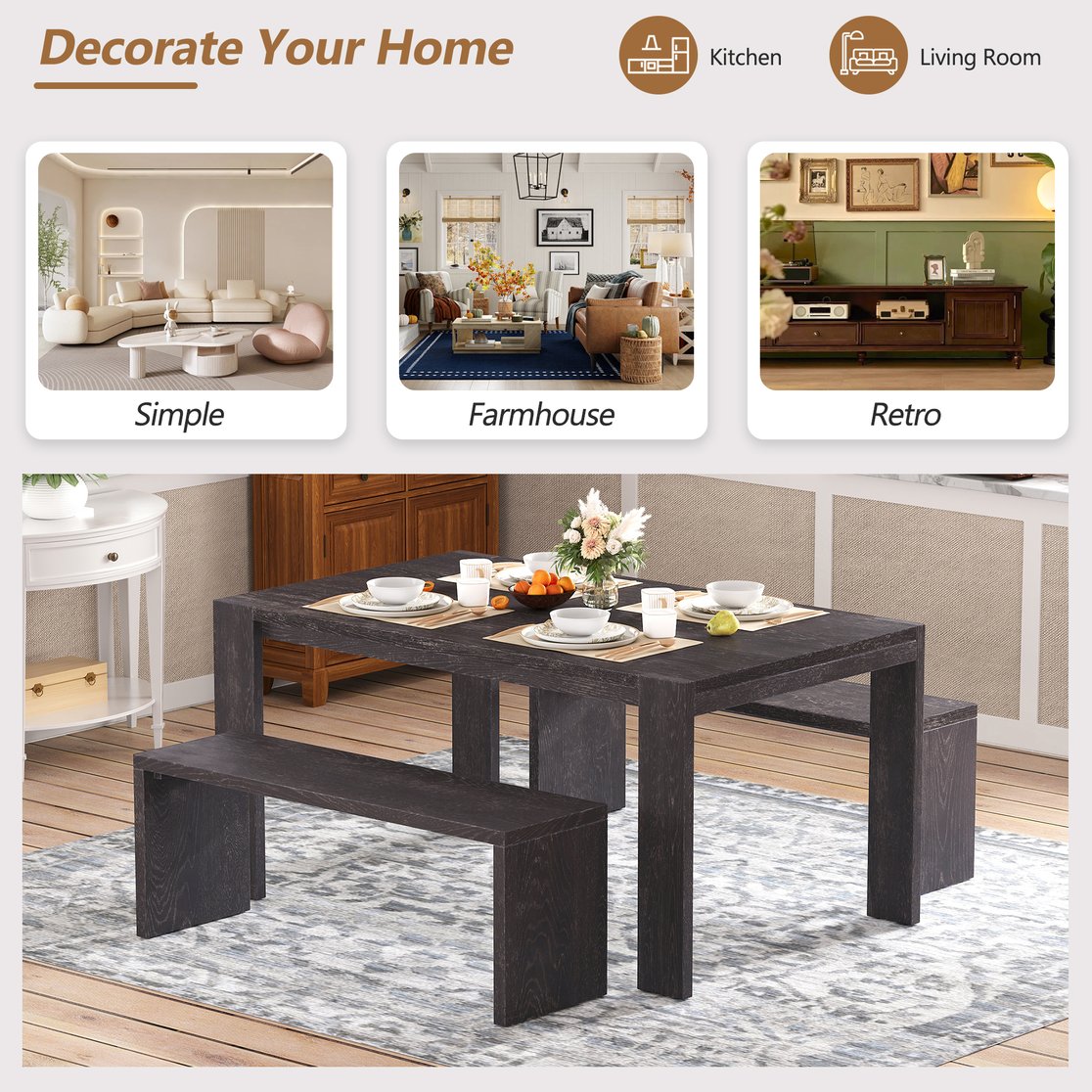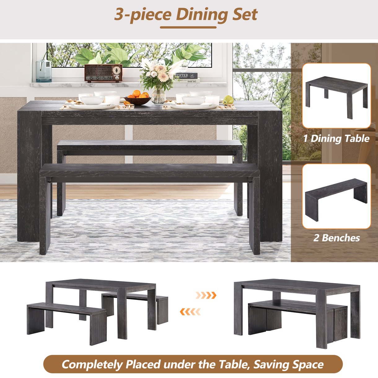 - 3-piece Dining Set: A dining table and two benches Included. The two benches can be completely placed under the table, increasing space utilization. The bench design replaces the traditional dining chairs, not only increasing the seating capacity, but also making the space around the dining table more open and transparent.