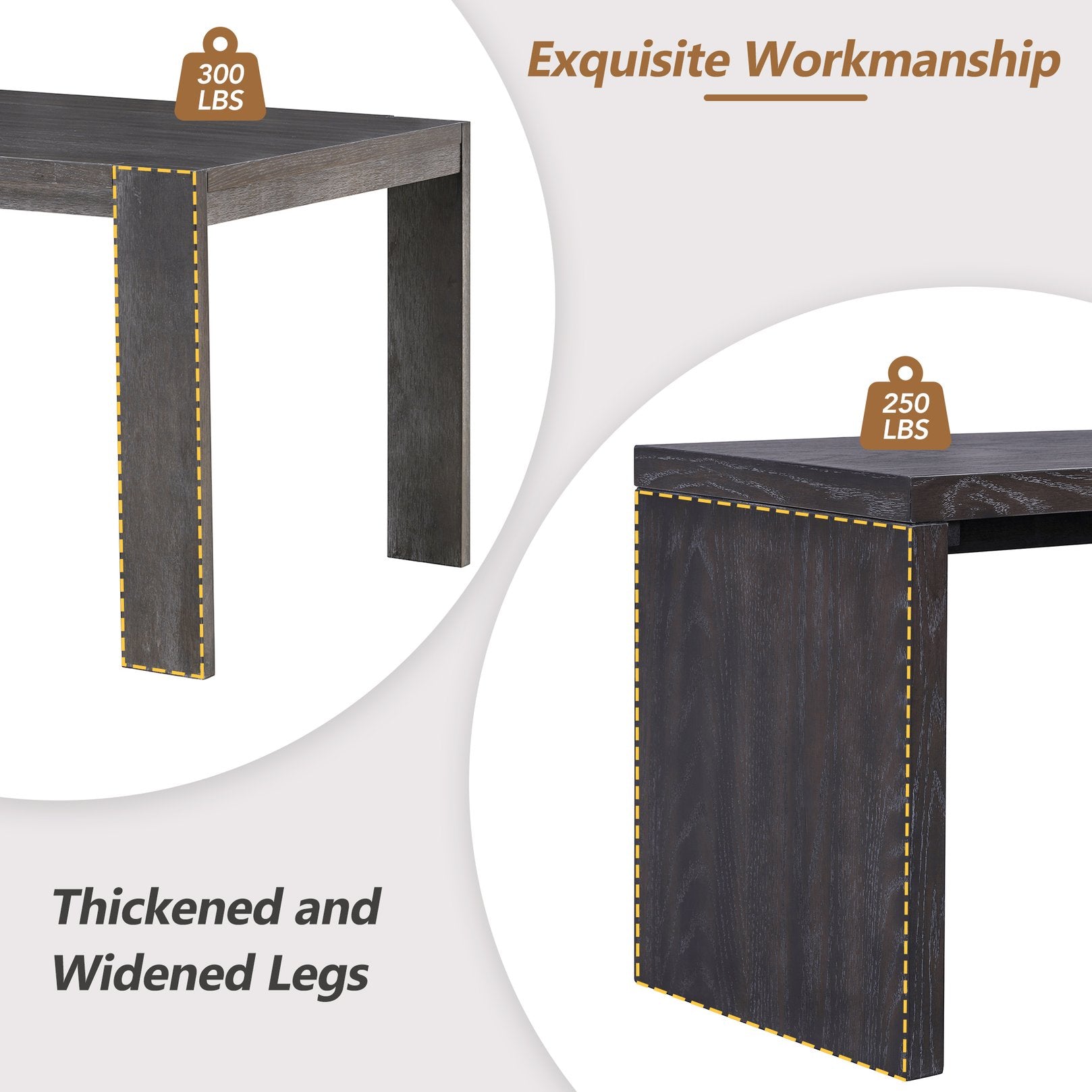 - Exquisite Workmanship: The table legs are designed to be thicker and thicker to ensure its stability. The tabletop load-bearing capacity is 300LBS, and the bench load-bearing capacity is 200LBS. It can easily meet the needs of daily family dining and gatherings.