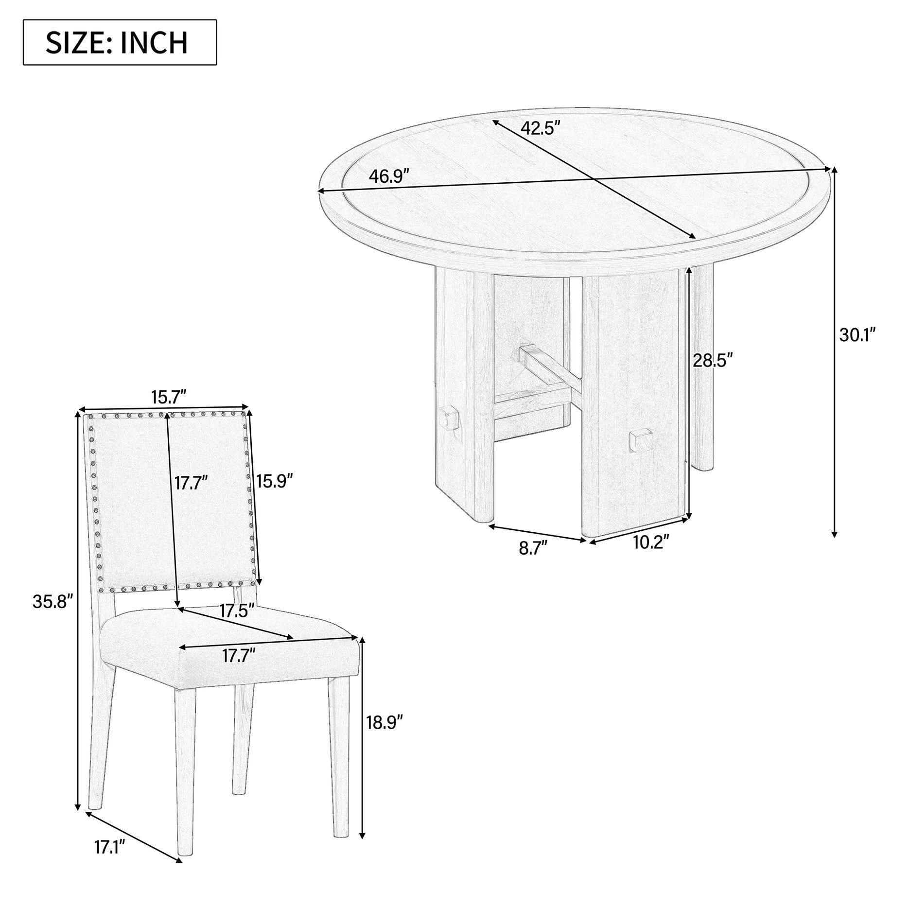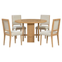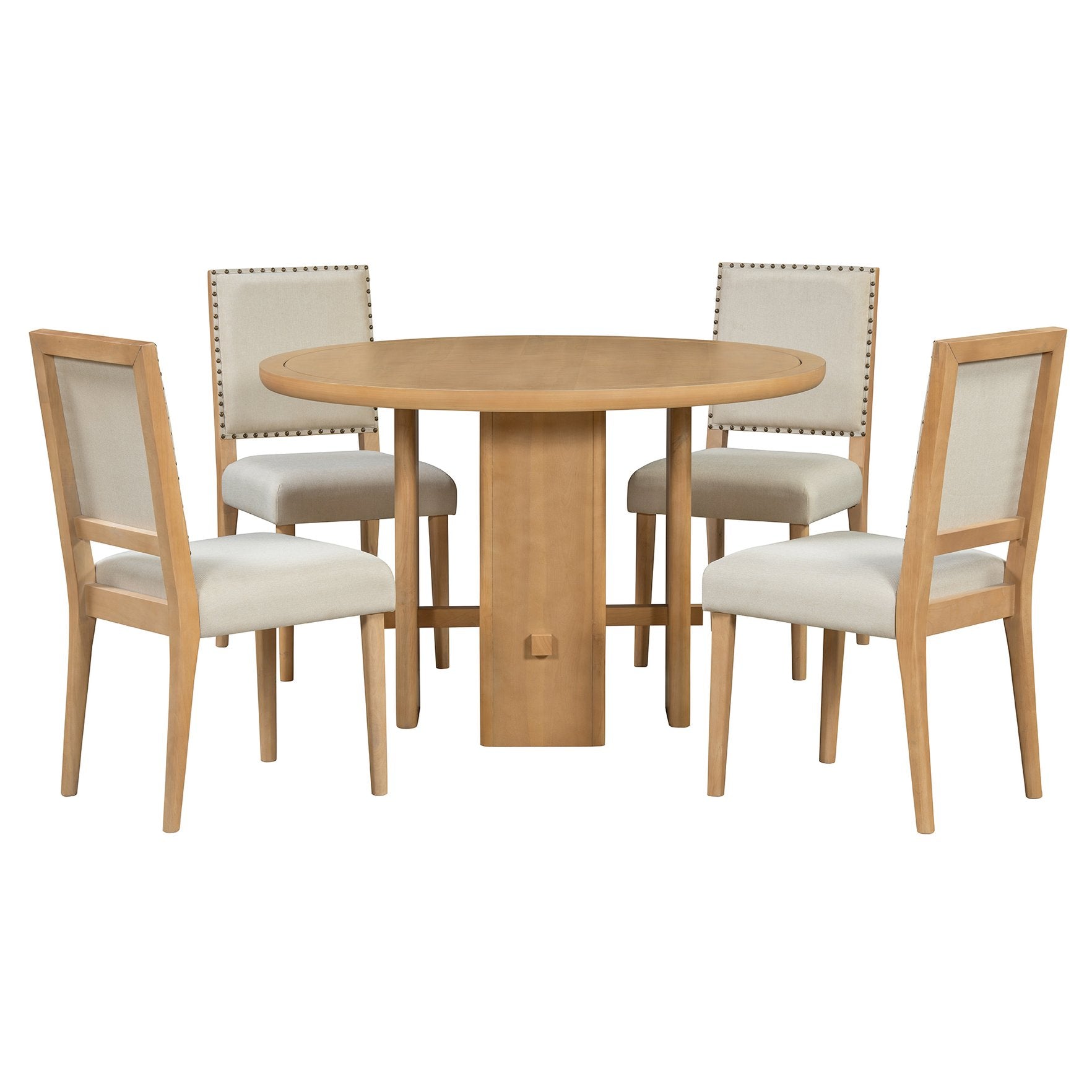 Bring warm, rustic charm to your dining space with this 5-piece round dining set that pairs a minimalist farmhouse table with four upholstered solid wood chairs. Thoughtfully crafted details—like a veneer-finished round tabletop, tapered wood legs, and cushioned seats—deliver both style and everyday comfort for family meals or intimate gatherings.