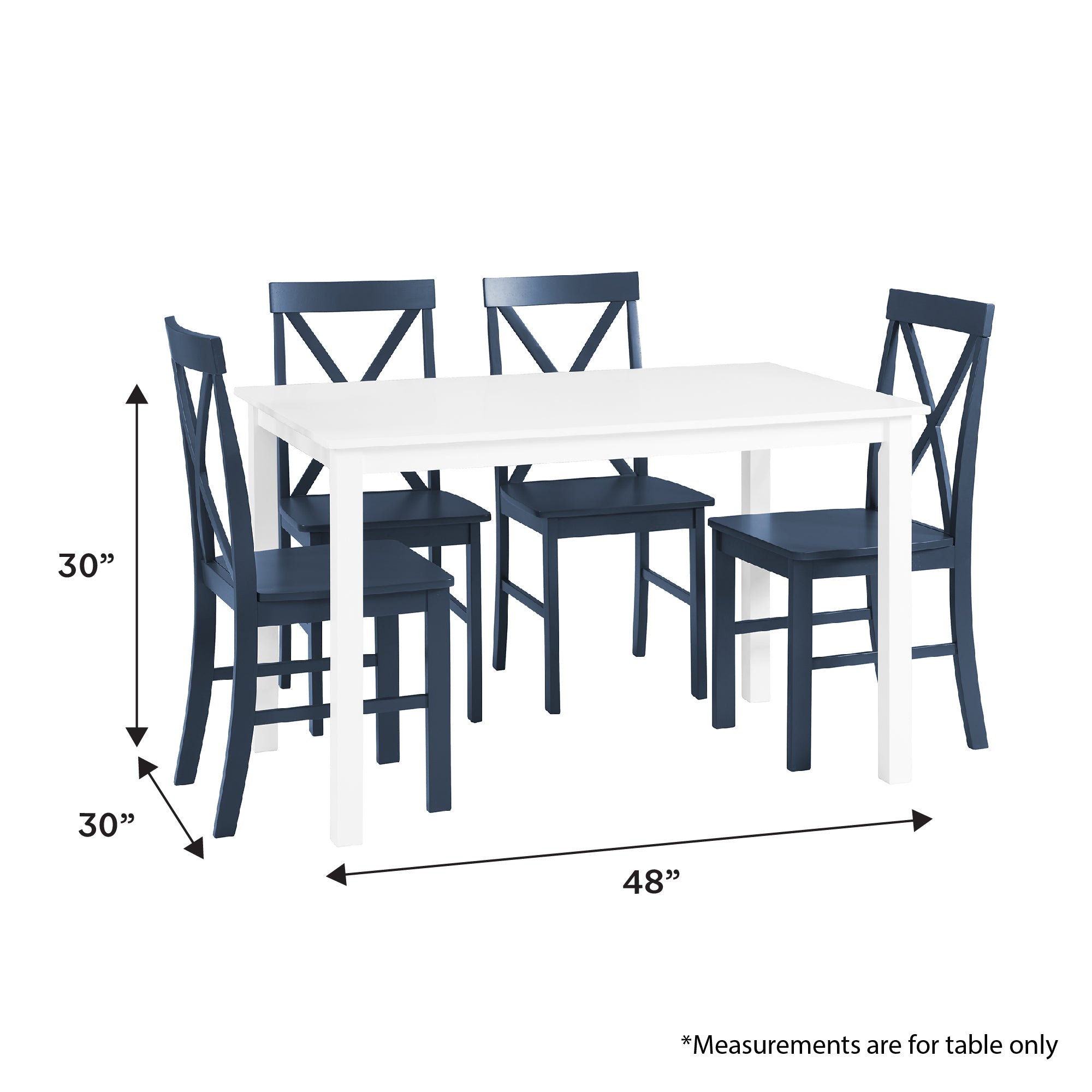Bring timeless farmhouse charm to your dining area with this Classic 5-Piece Dining Set. Designed for small-space living, the set pairs a sturdy solid wood table with four X-back chairs in a crisp white frame and navy seat accents for a clean, versatile look that complements casual and modern farmhouse interiors.